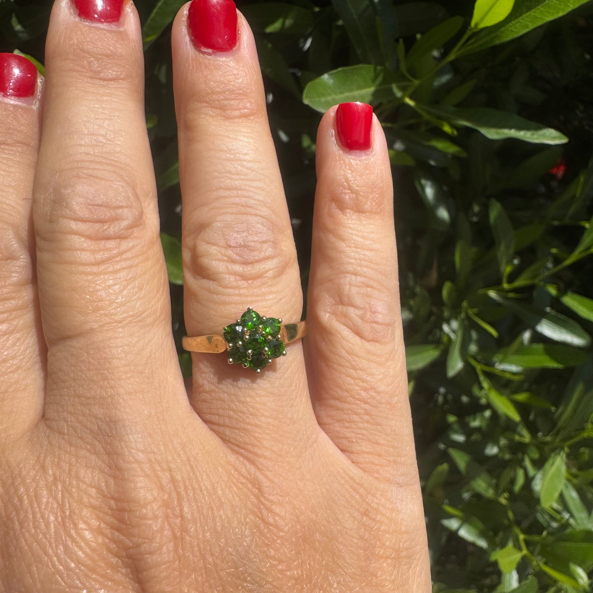 10K gold ring set with vivid green gemstones in a delicate floral cluster