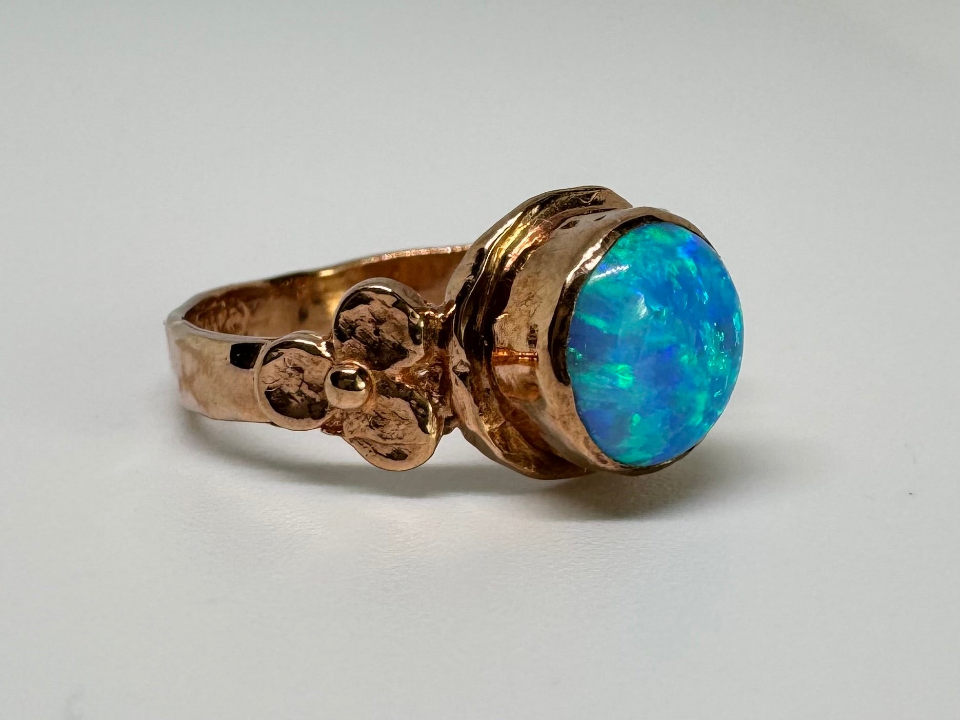 טבעת זהב אדום 10 קראט משובצת אבן אופל בחיתוך עגול מהפנט עם הבזקי צבע כחולים-ירקרקים ולבנים.