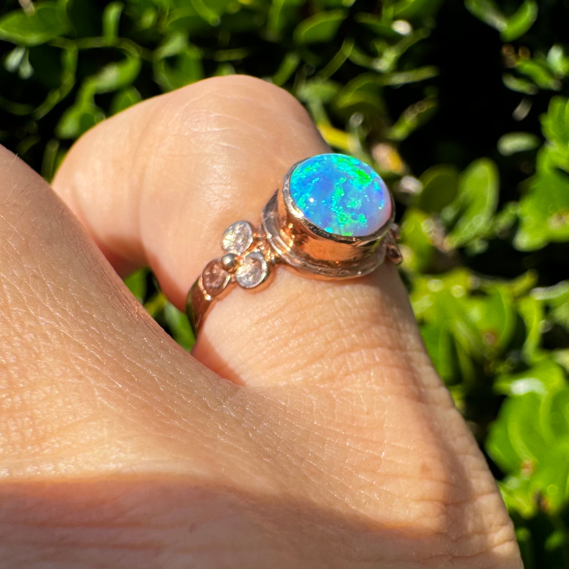 10K rose gold ring set with round Opal with vibrant flashes of blue, green and white