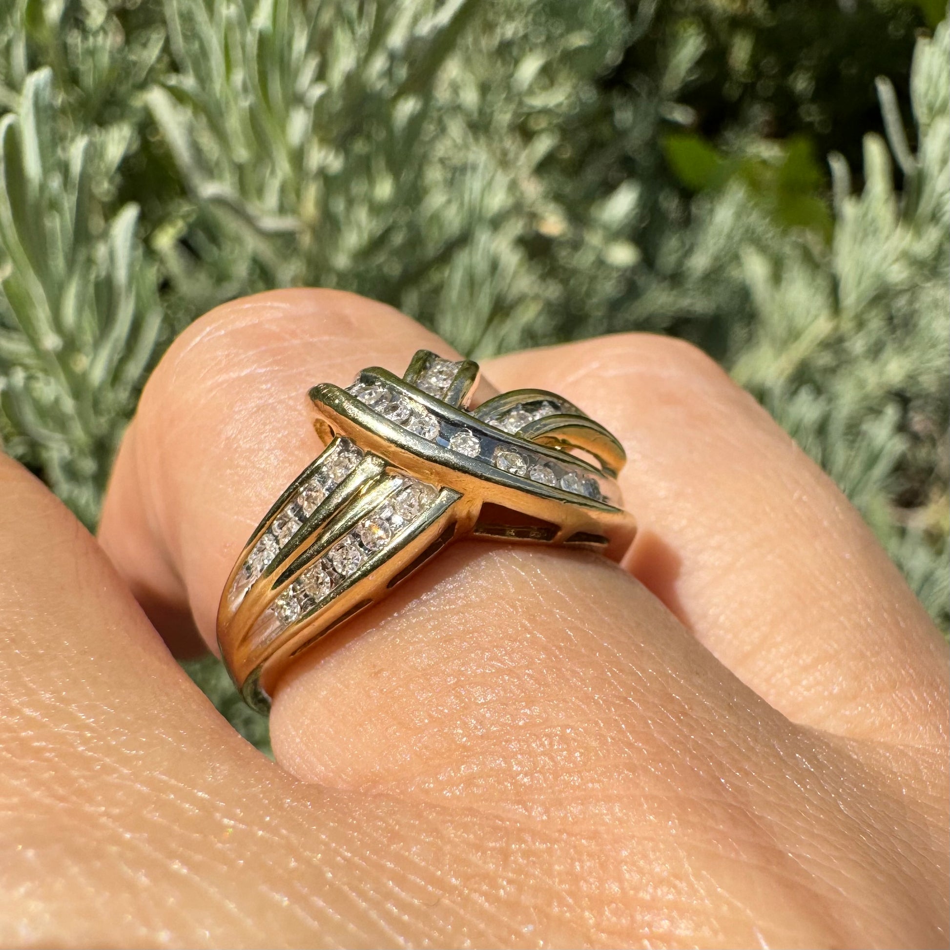 טבעת זהב צהוב 14 קראט משובצת יהלומים בעיצוב שזור