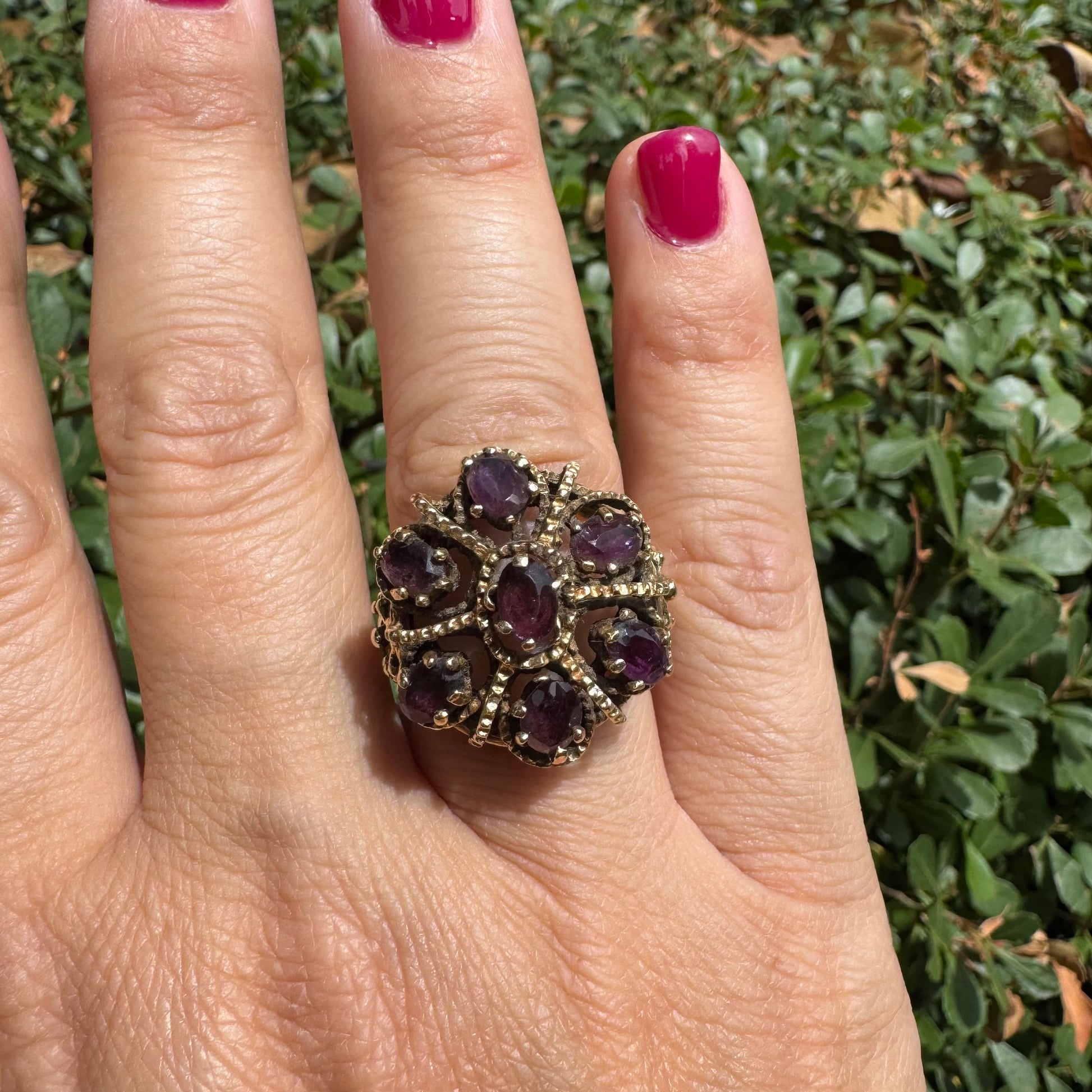 14K gold cocktail ring set with a stunning cluster of deep purple Garnet stones in marquise cuts.