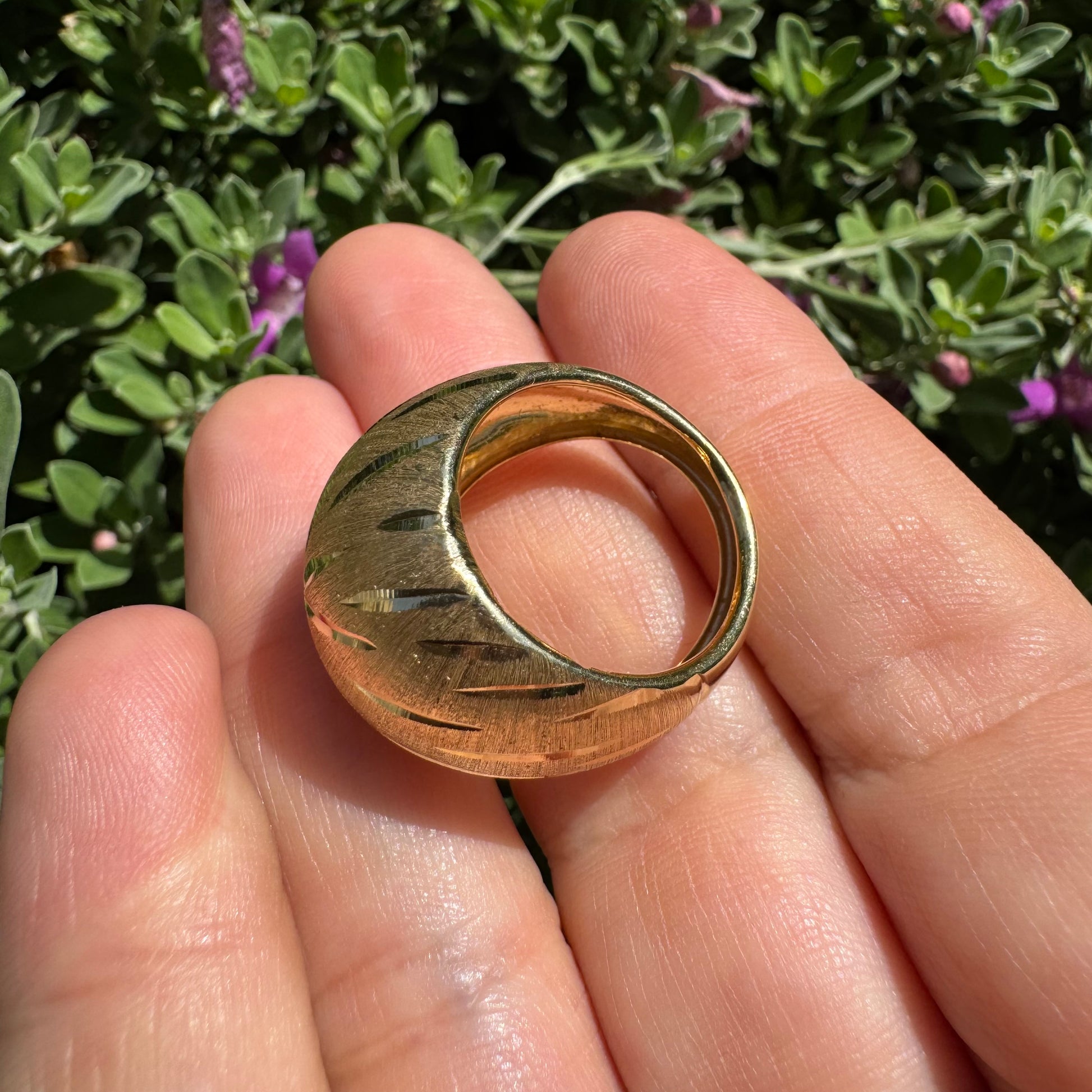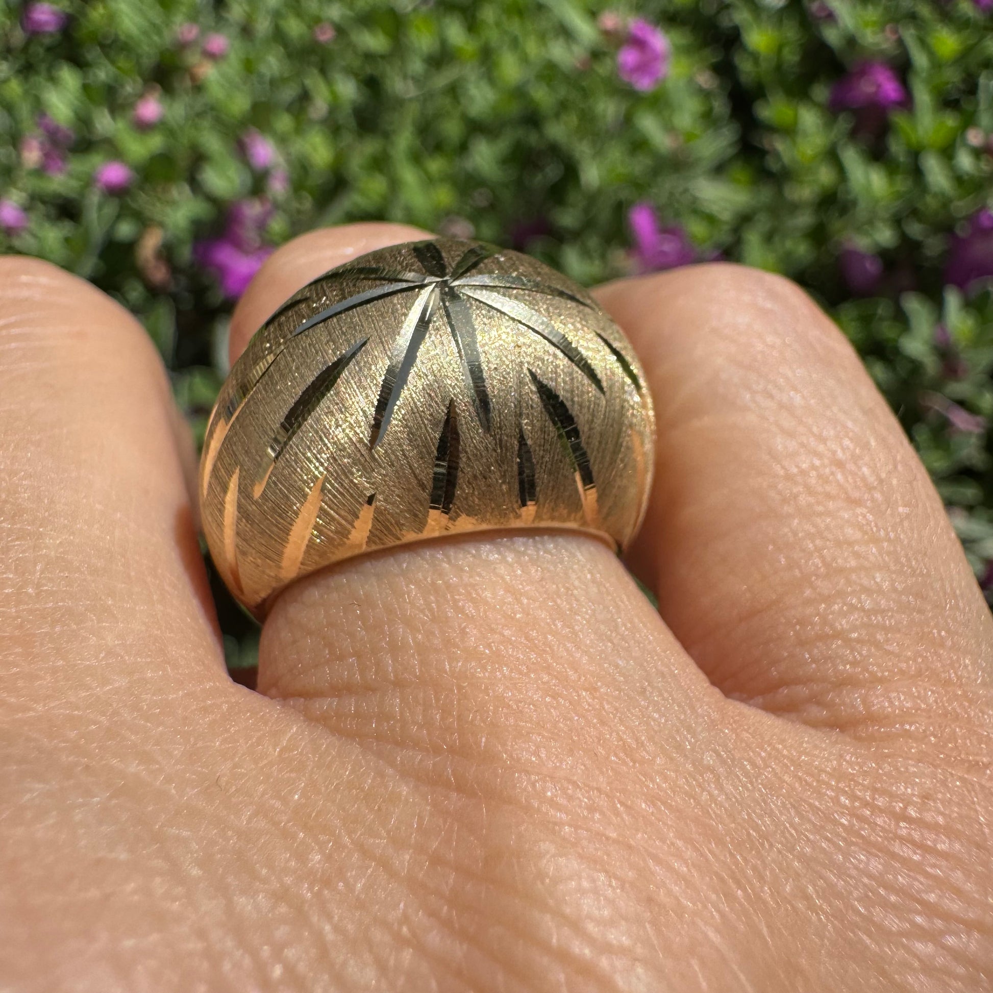 14K gold dome ring crafted in textured gold, featuring intricate engraved starburst detailing