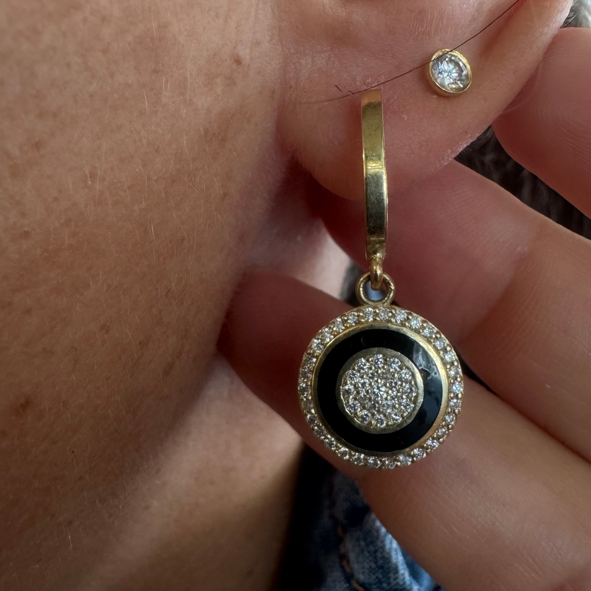 14K yellow gold drop earring with a round black enamel centerpiece, accented by a circle of sparkling pavé Diamonds in the center and a border of pavé Diamonds around the edge.