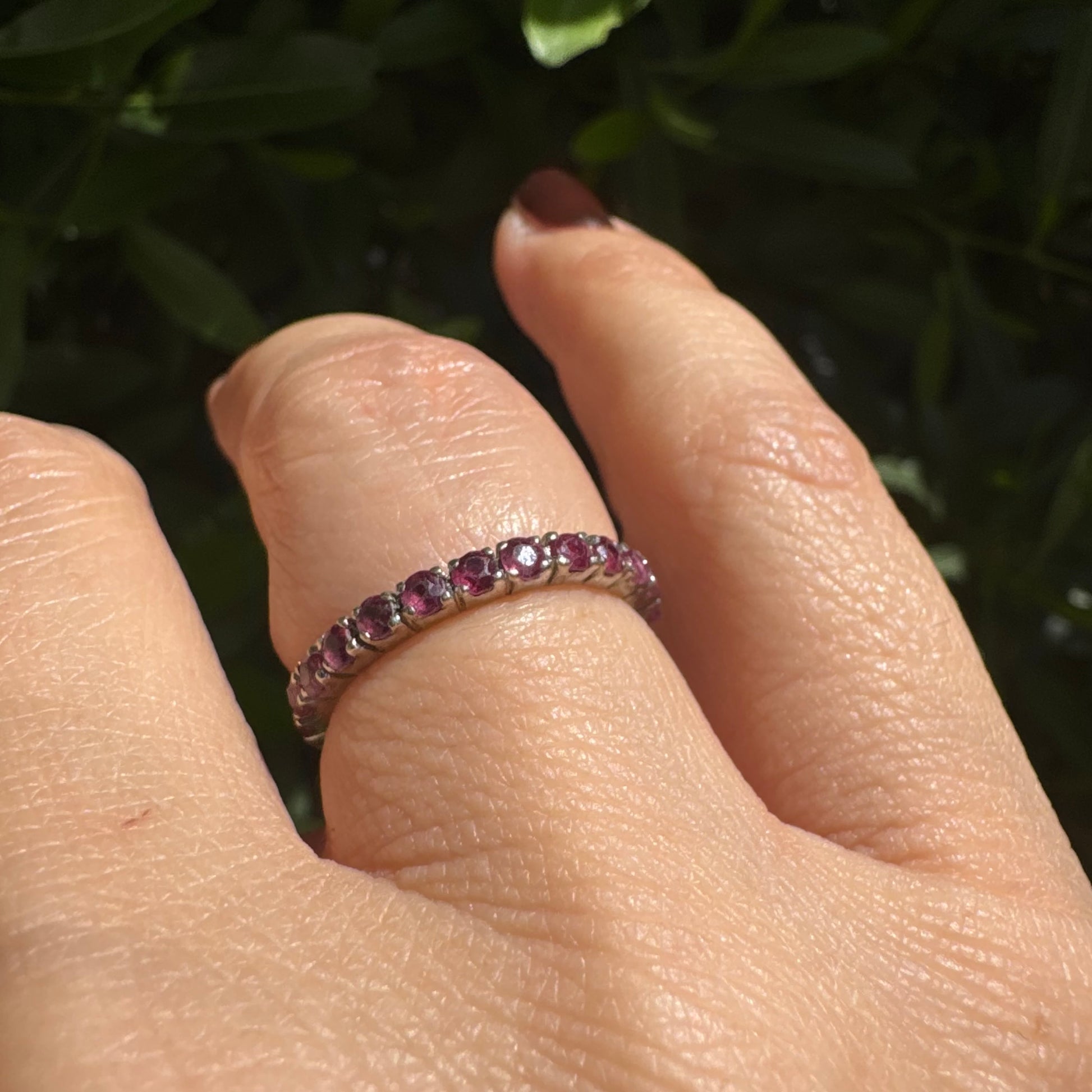 טבעת זהב לבן 14 קראט משובצת אבני רובי לכל האורך
