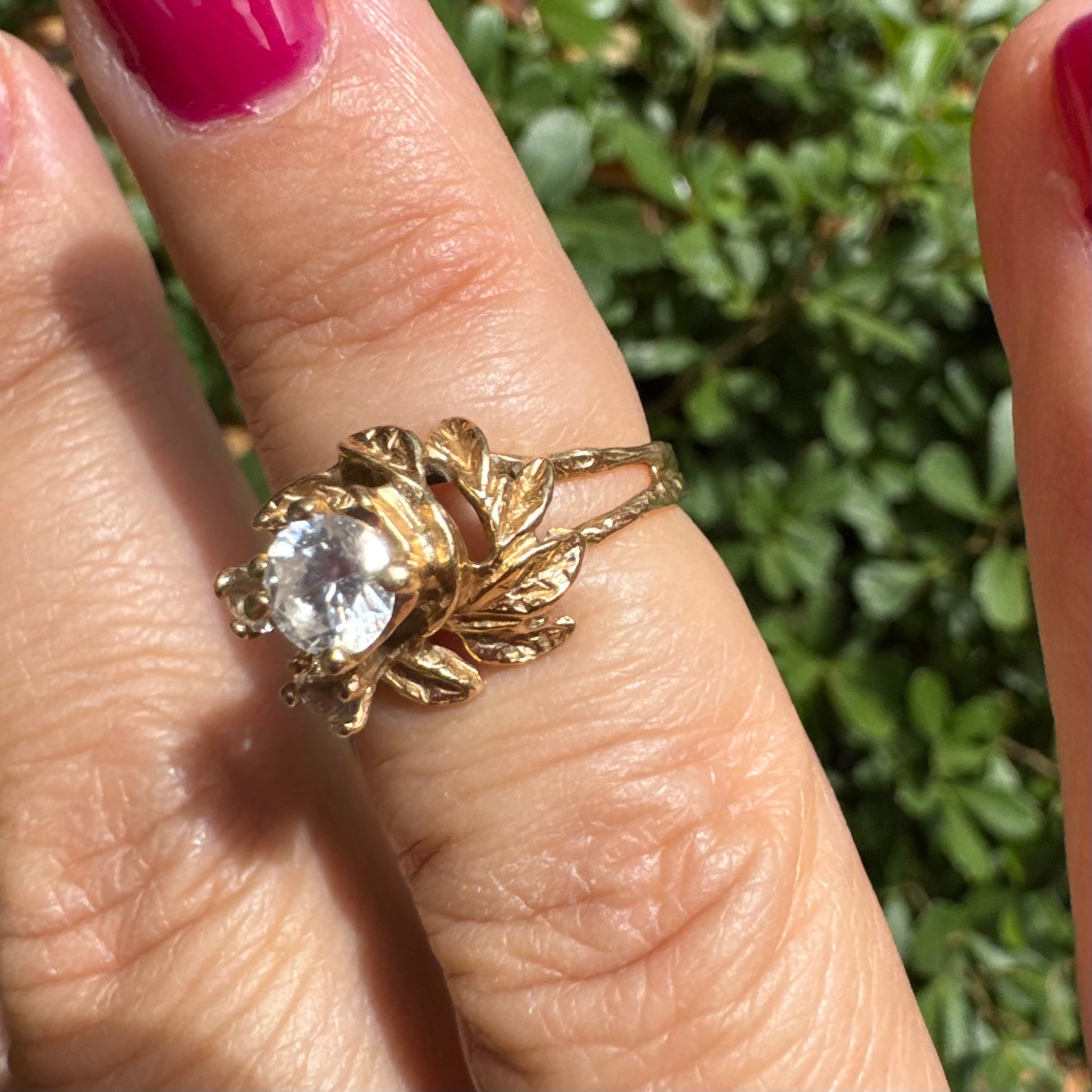 טבעת זהב צהוב 14 קראט בעלת עיצוב אורגני עשיר עם עלים מגולפים סביב שלוש אבנים שקופות נוצצות. (לא יהלומים)