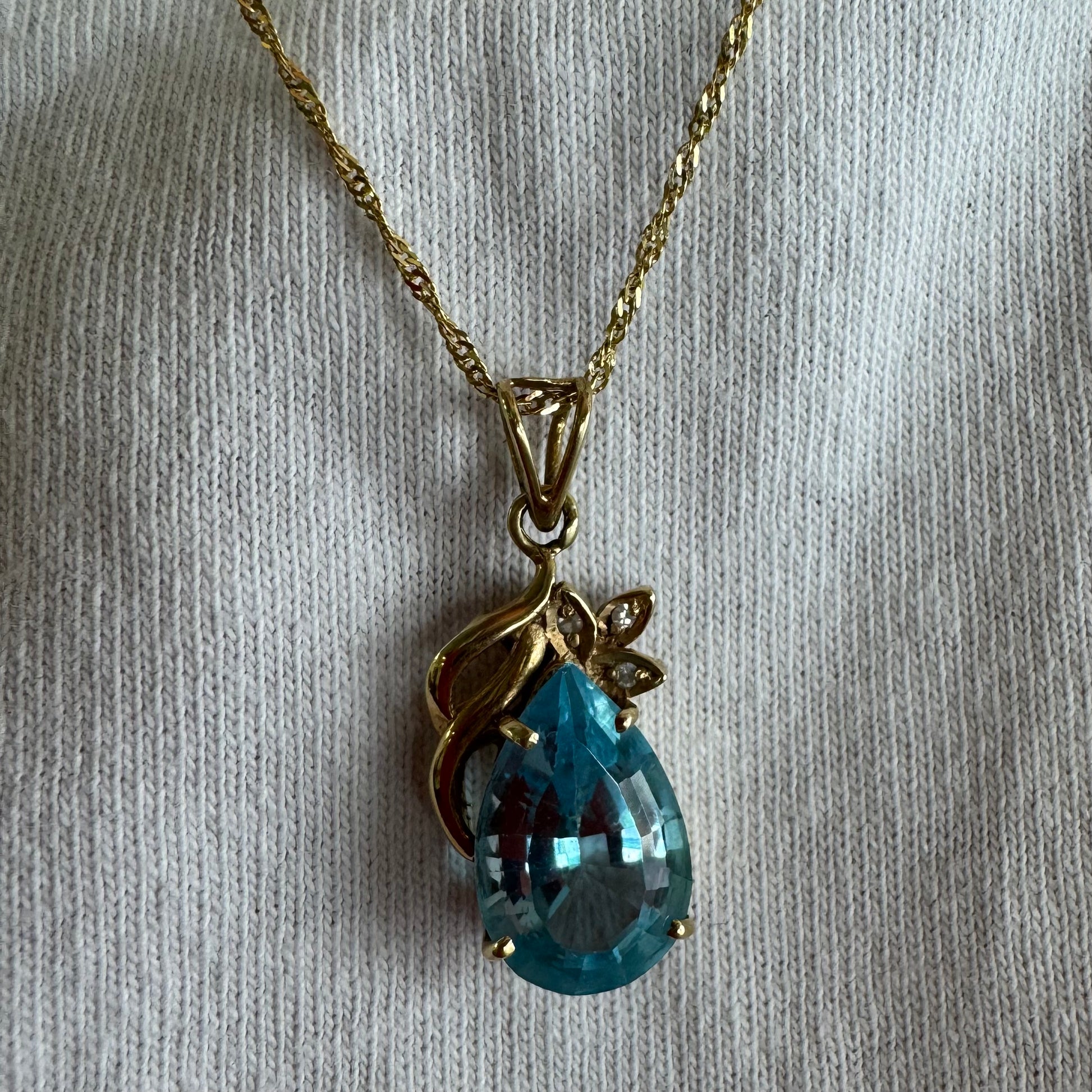 14K gold necklace set with Blue Topaz pendant in a teardrop cut