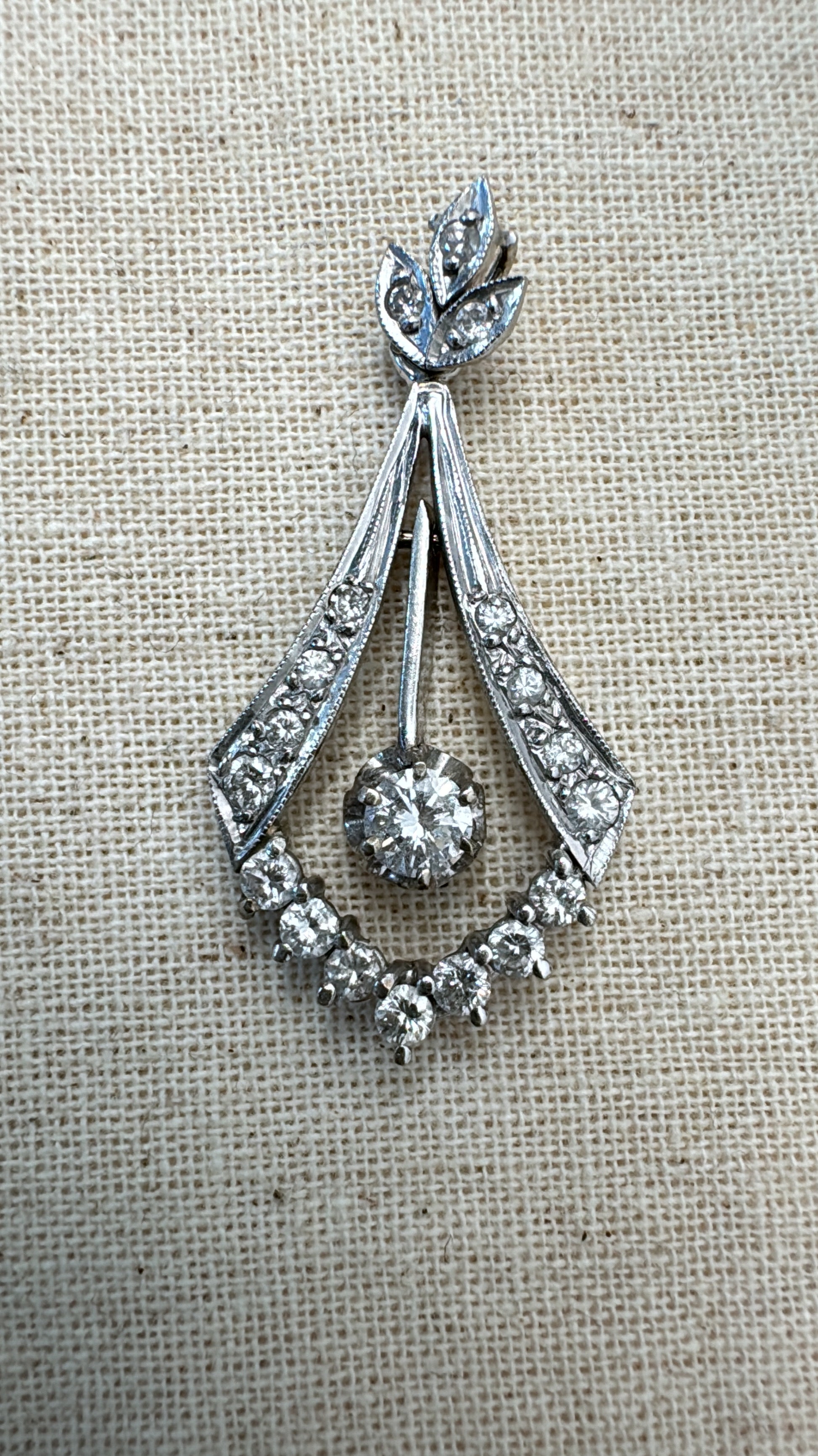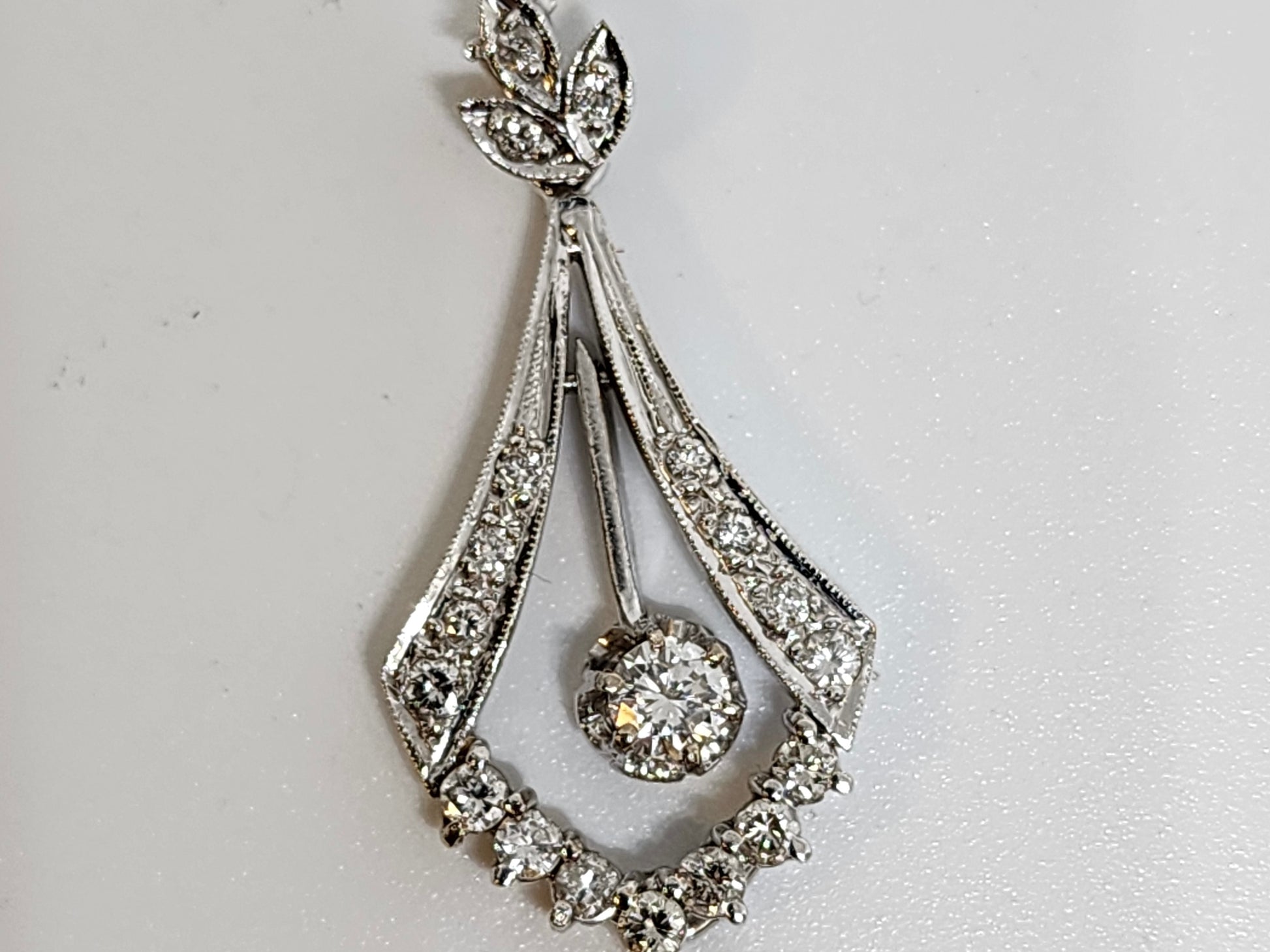 תליון זהב לבן 14 קראט משובץ יהלום מרכזי גדול ויהלומים מסביב.