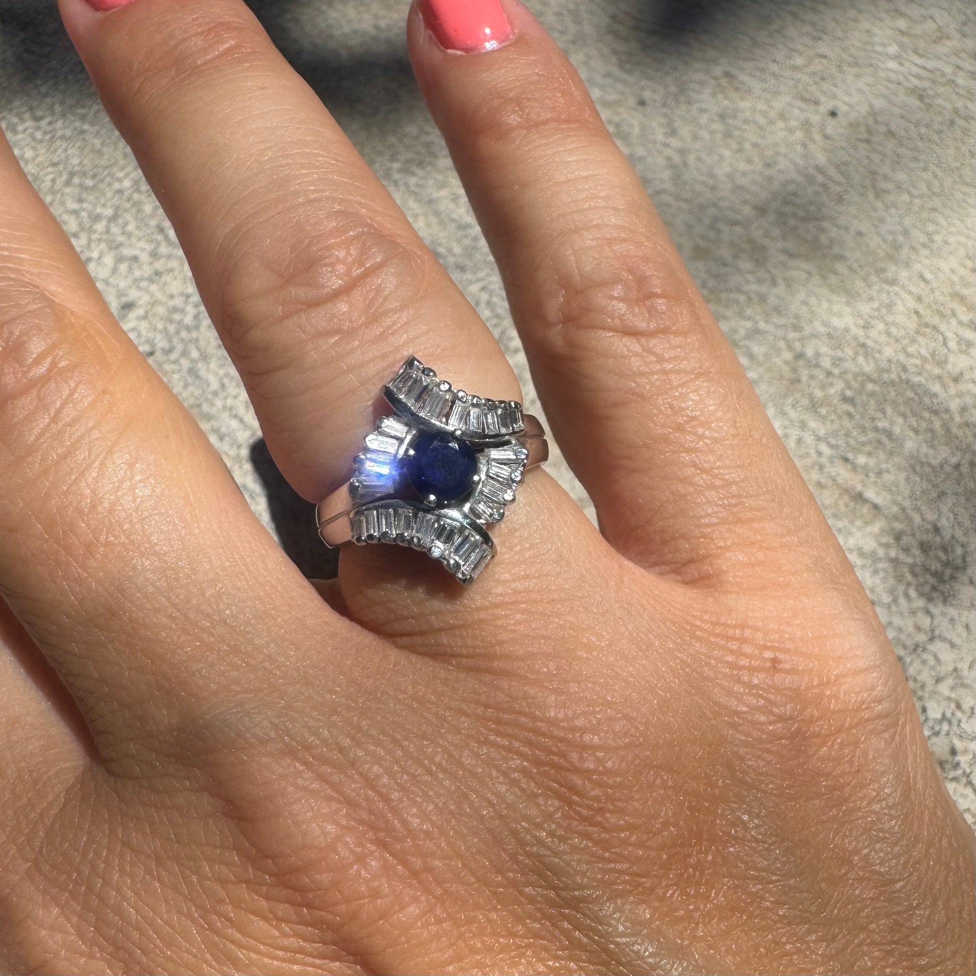 טבעת זהב לבן 14 קראט משובצת אבן ספיר בצבע כחול כהה בחיתוך מרקיזה ויהלומים מסביב
