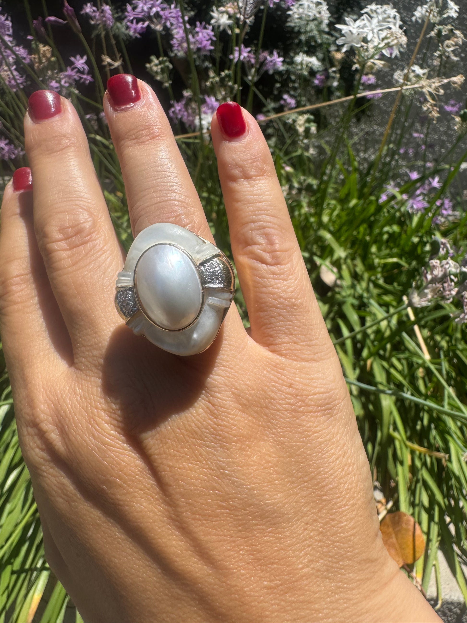 14K gold ring set with a natural mother-of-pearl centerpiece framed by delicate diamond accents