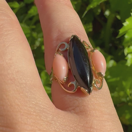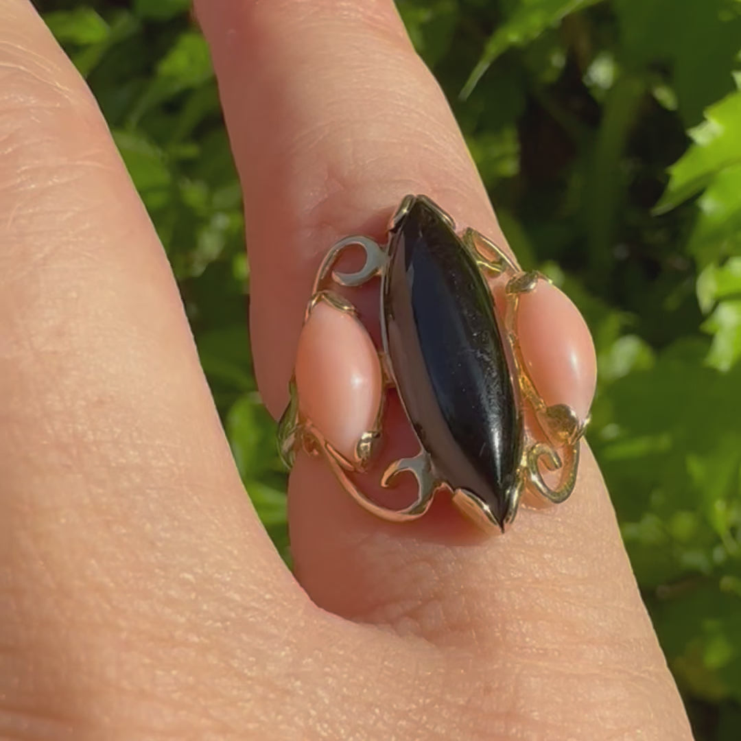 14K gold ring set with Black Onyx & Corals