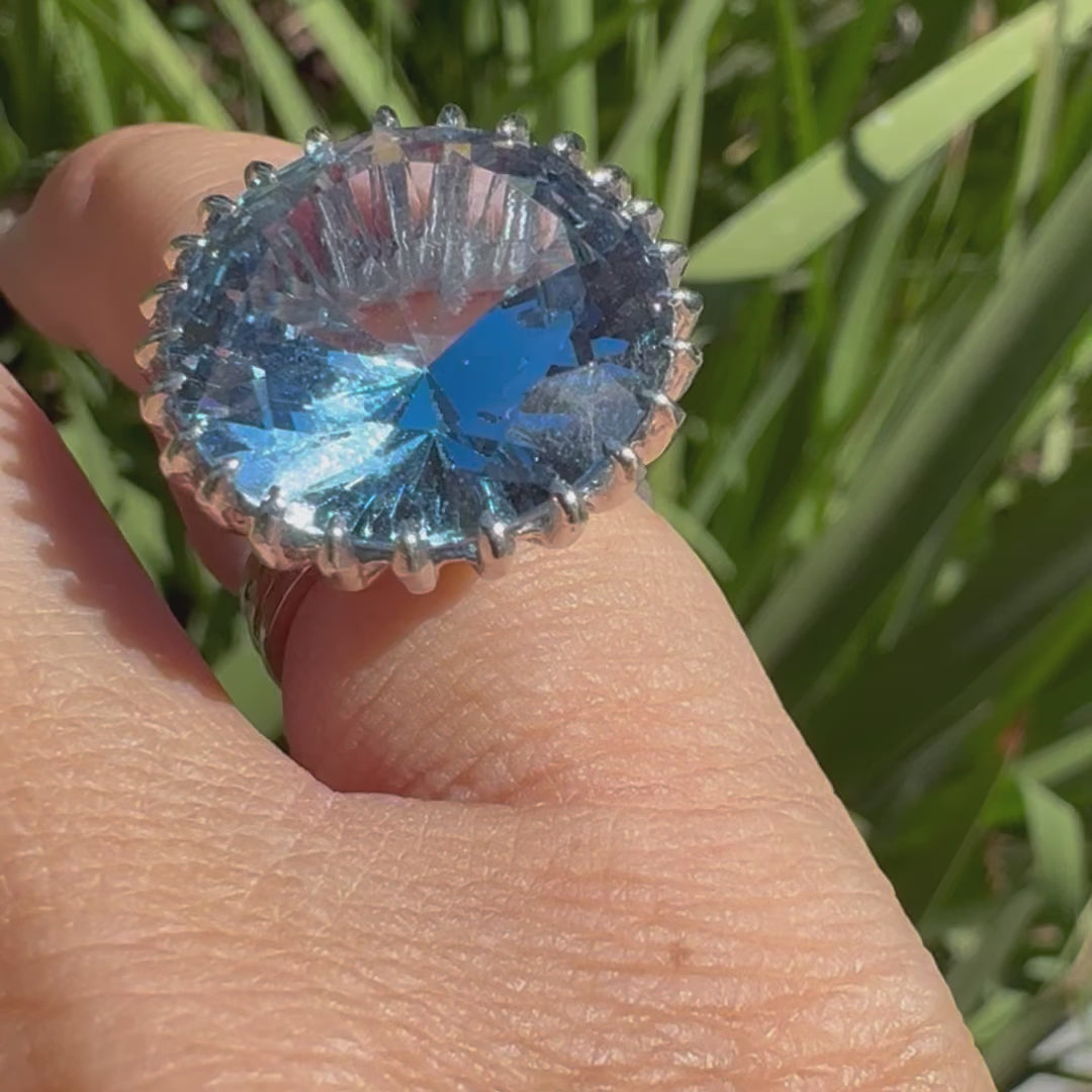 14K white gold ring featuring a large, round-cut light blue gemstone, set in a raised prong setting that gives it a striking and eye-catching look.
