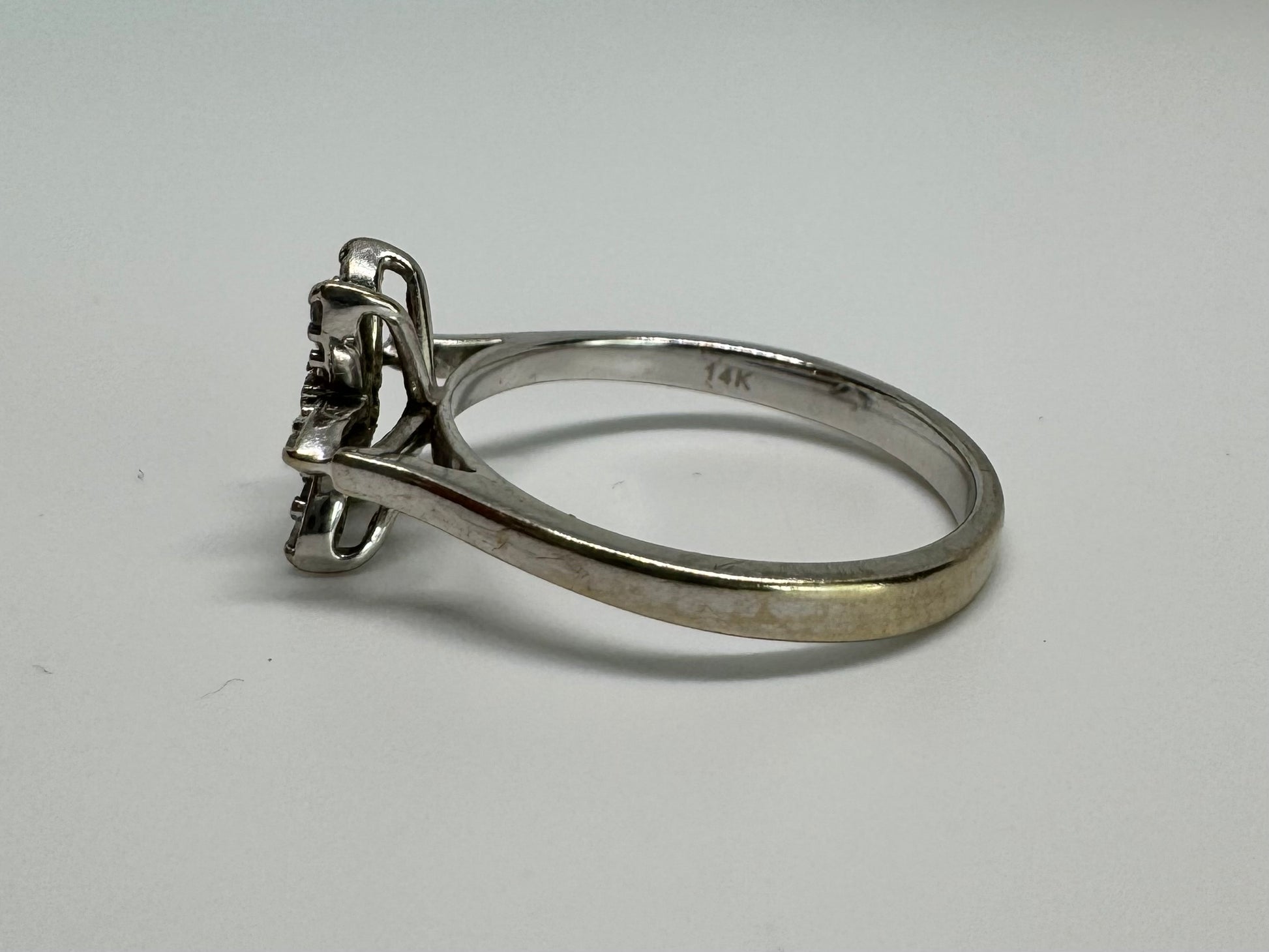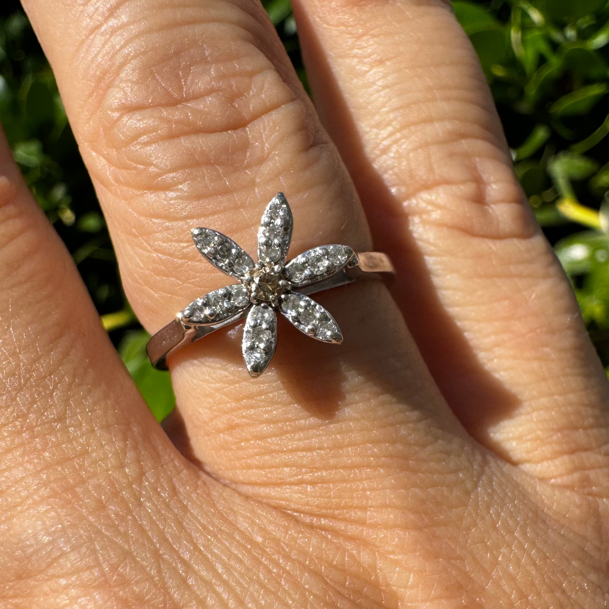 טבעת זהב לבן 14 קראט בעיצוב פרח בעל שישה עלי כותרת, שכל אחד מהם משובץ ביהלומים קטנים ומנצנצים.