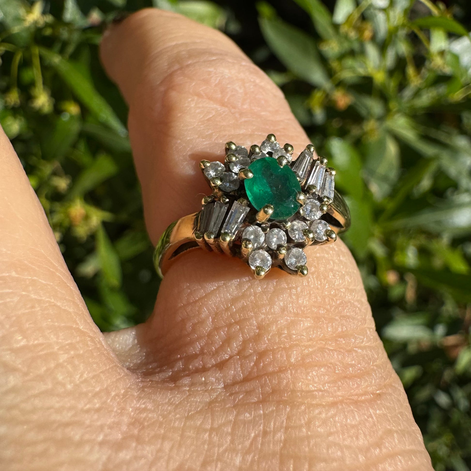 טבעת זהב צהוב 14 קראט משובצת אבן אמרלד במרכז ויהלומים בחיתוכים שונים