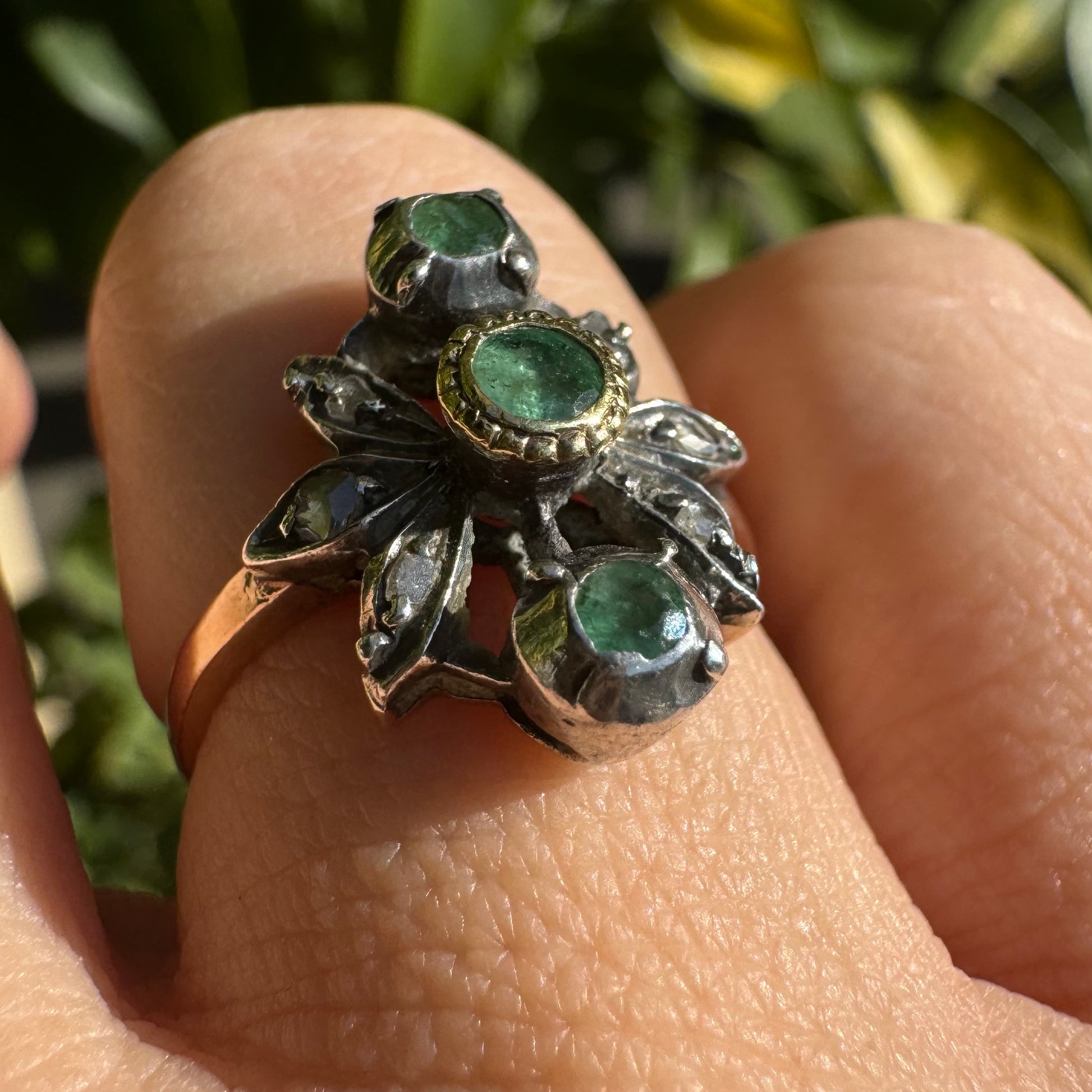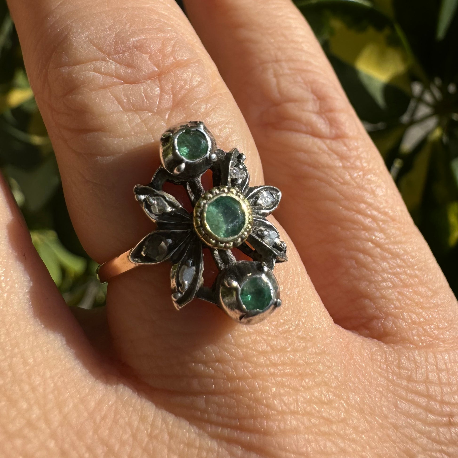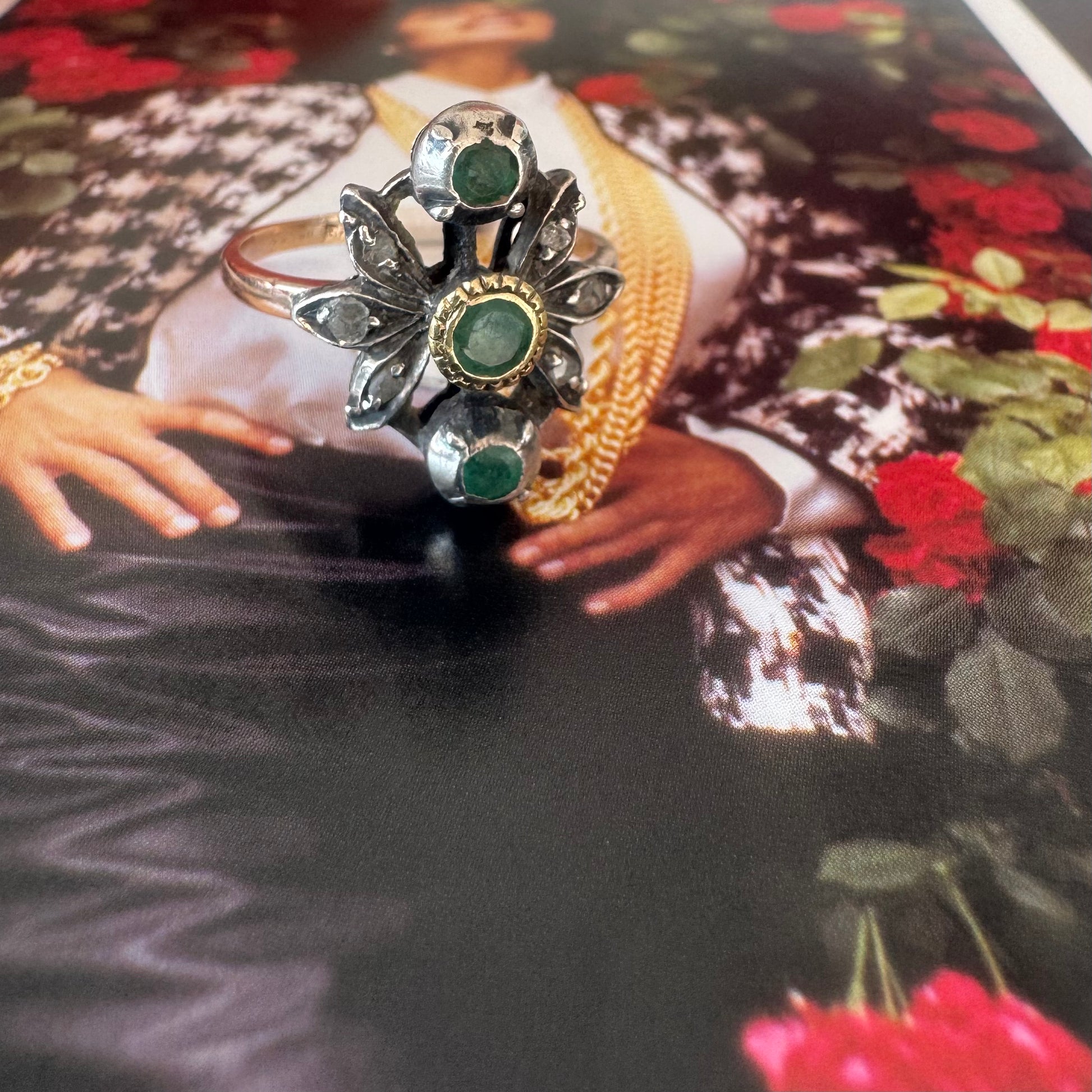 טבעת זהב צהוב 14 קראט משובצת אבני אמרלד ויהלומים