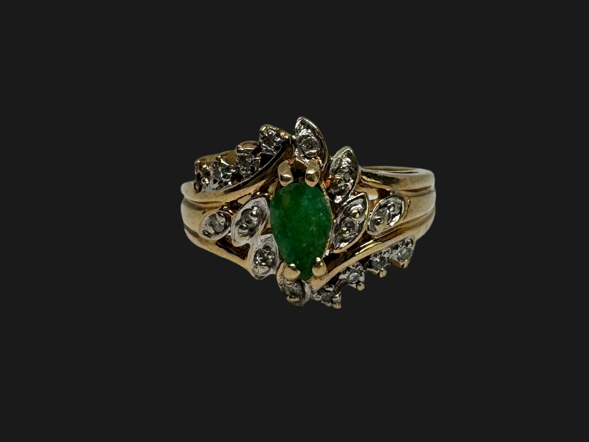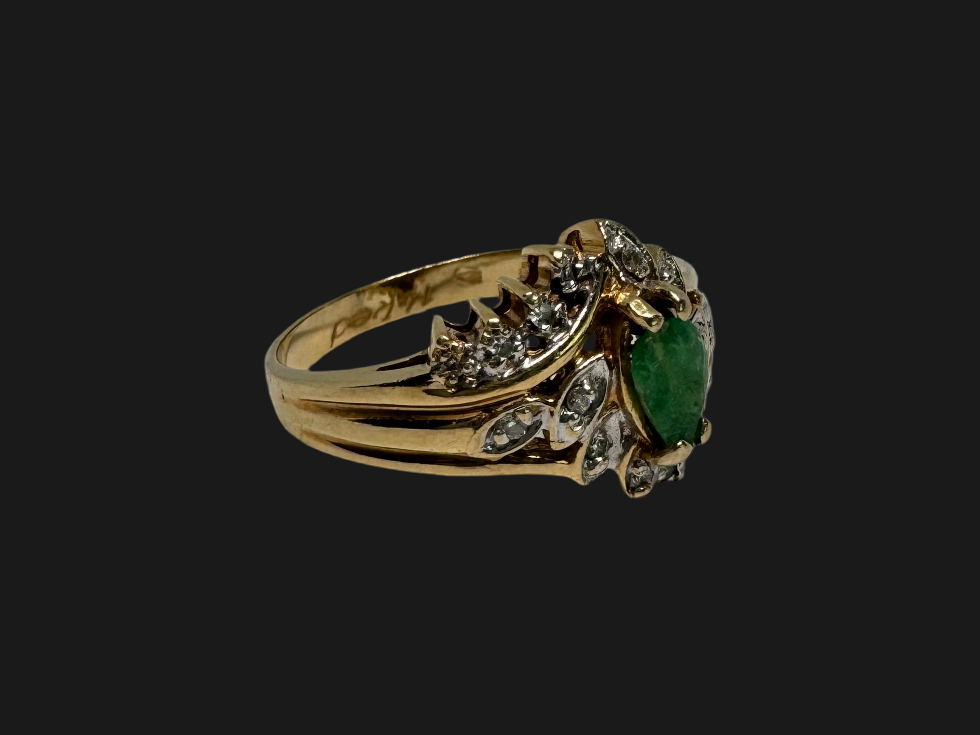 טבעת זהב צהוב 14 קראט משובצת אבן אמרלד ויהלומים