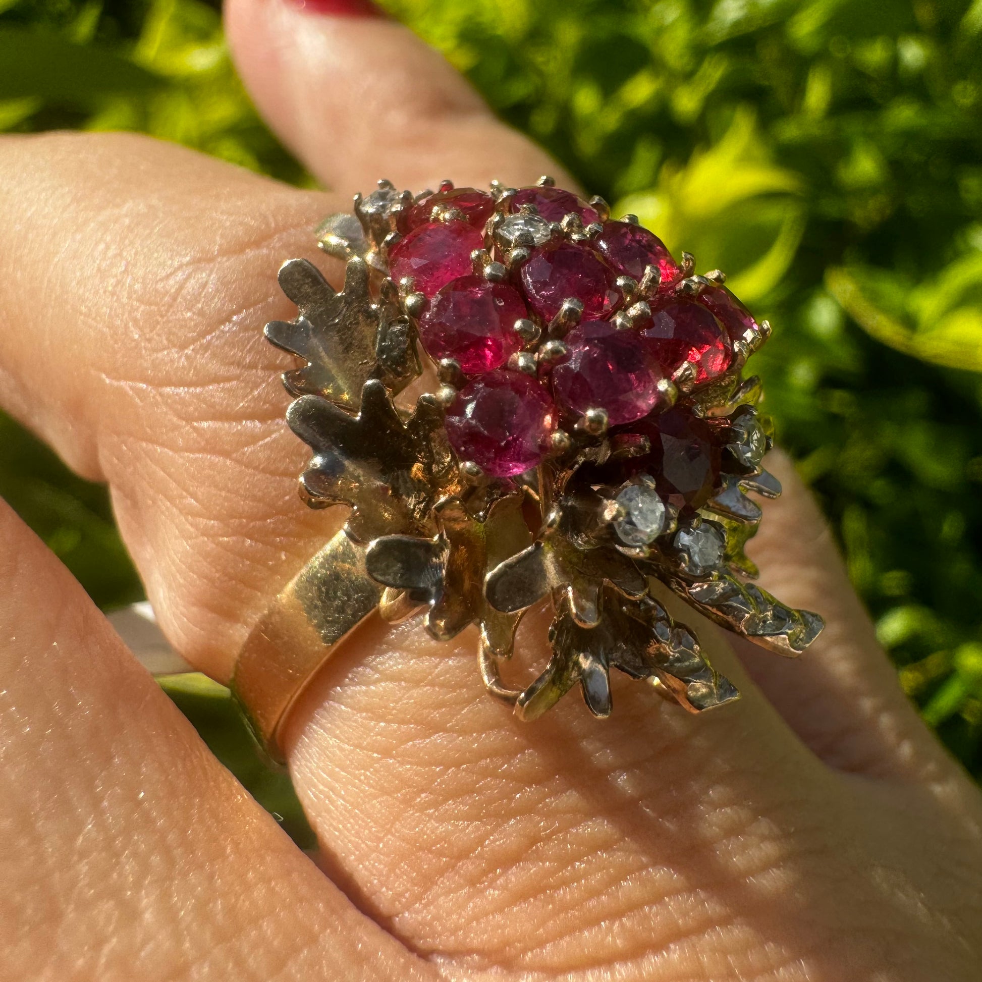 טבעת זהב צהוב 14 קראט משובצת באשכול אבני רובי עזות וביהלומים קטנים, בעיצוב שמדמה פרח או זר עלים מלכותי.