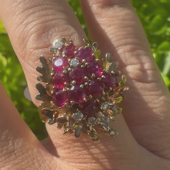 14K gold ring set with a vibrant cluster of deep red rubies and sparkling diamonds.
