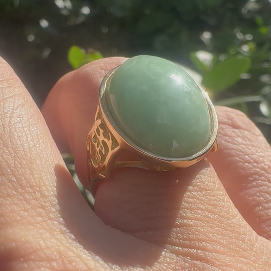 14K gold ring featuring a large oval light green Jade with a smooth polished finish, set in a classic bezel setting.