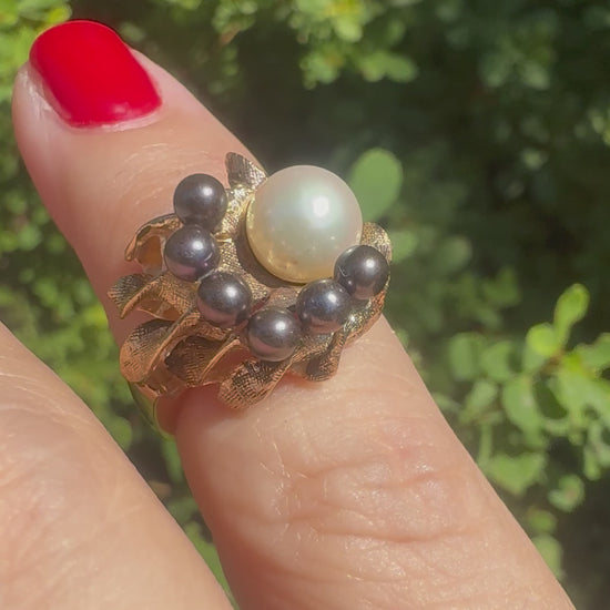 14K gold ring set with a luminous white Pearl at its center surrounded by a delicate circle of black Pearls.