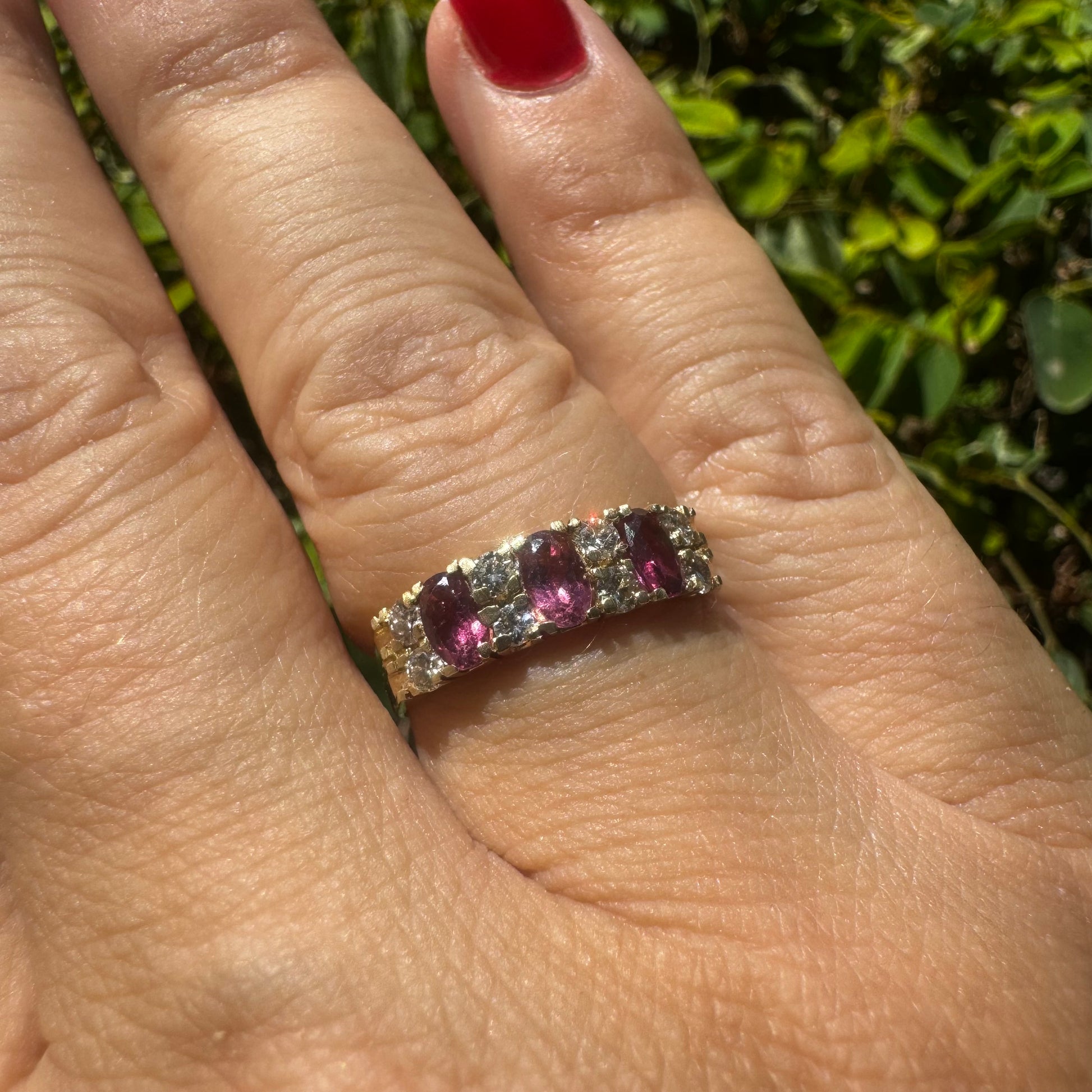 טבעת זהב צהוב 14 קראט משובצת בשורות של אבני טורמלין בצבע ורוד אובליות ונוצצות, כשביניהן שיבוצים של יהלומים עגולים שמוסיפים לה ברק וזוהר.