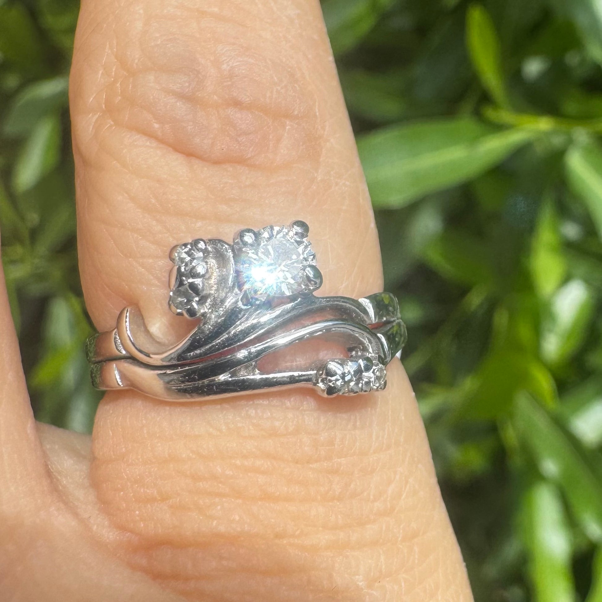 טבעת זהב לבן 14 קראט עם נגיעות רכות וזורמות, משובצת יהלומים עדינים במראה רומנטי ועל-זמני.