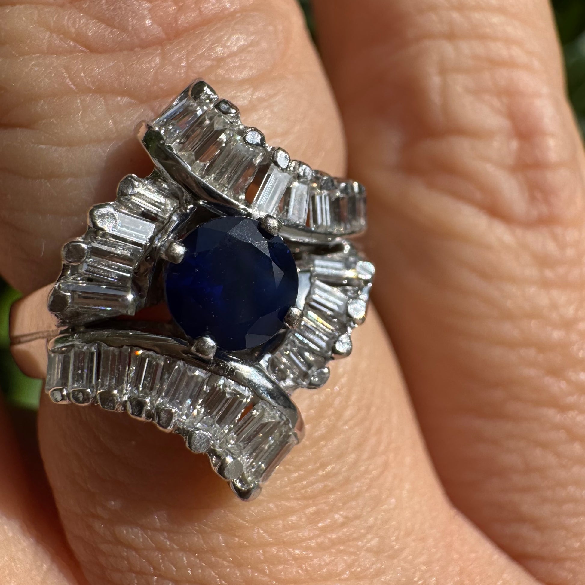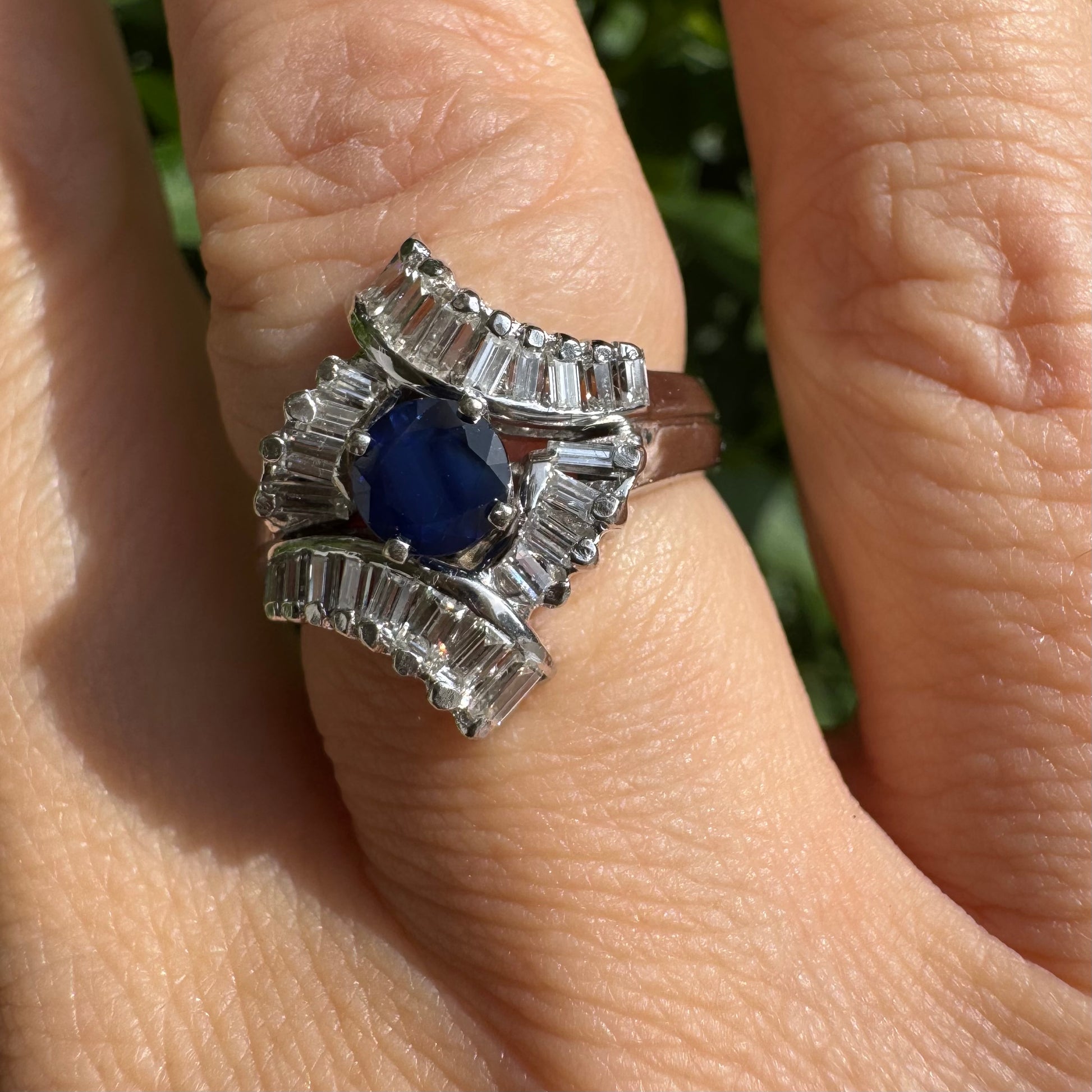 טבעת זהב לבן 14 קראט בעיצוב גלאם עתיק, משובצת ספיר כחולה עגולה במרכז, ומשובצת יהלומים בחיתוך באגט היוצרים צורת מניפה סימטרית ומרקם תלת־ממדי מרהיב.