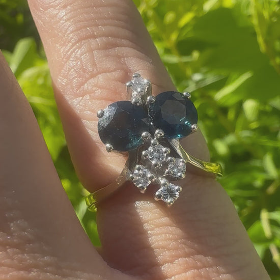 14K gold ring set with two deep blue oval Sapphires accented by clusters of brilliant white Diamonds.