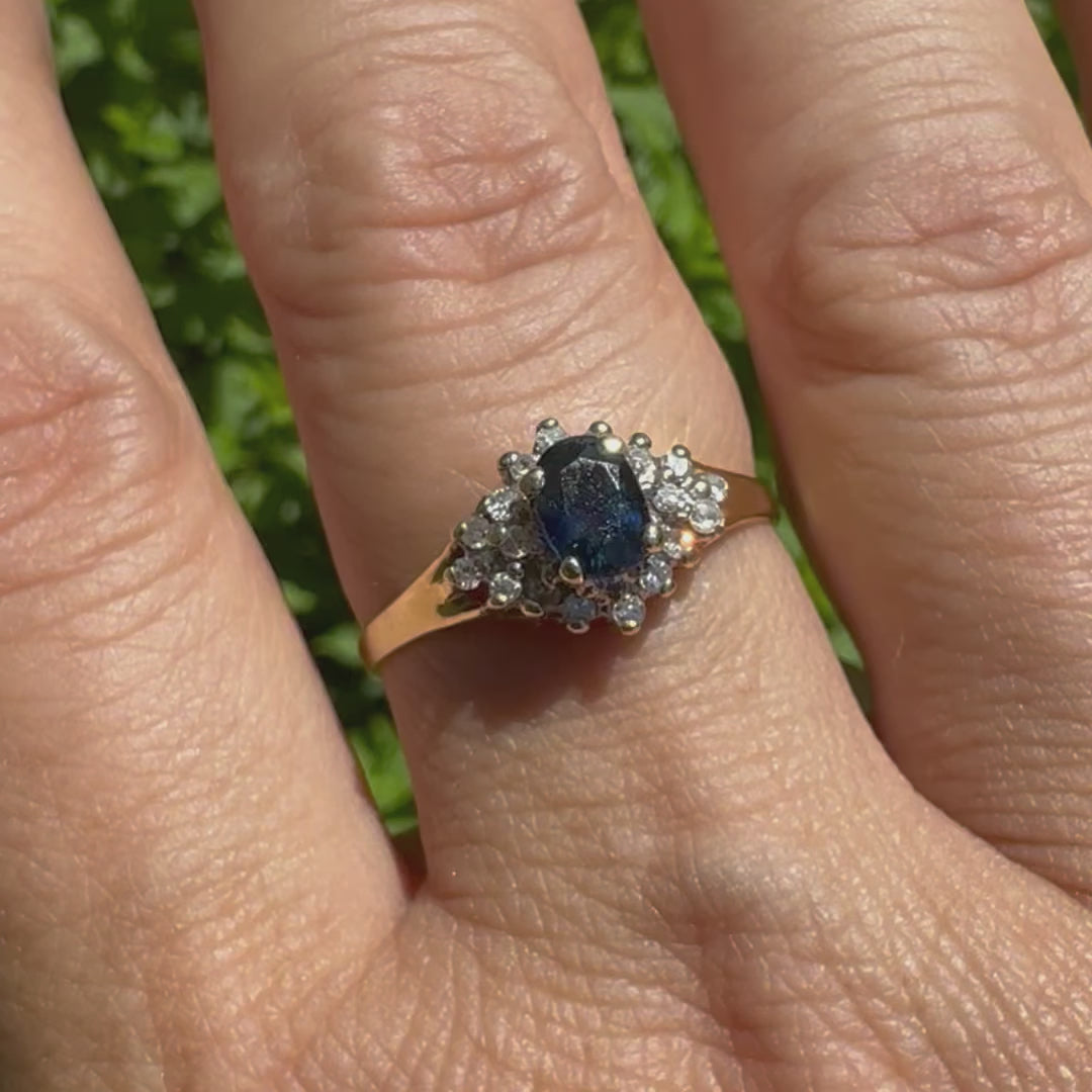 14K yellow gold ring set with an oval blue Sapphire surrounded by sparkling Diamonds