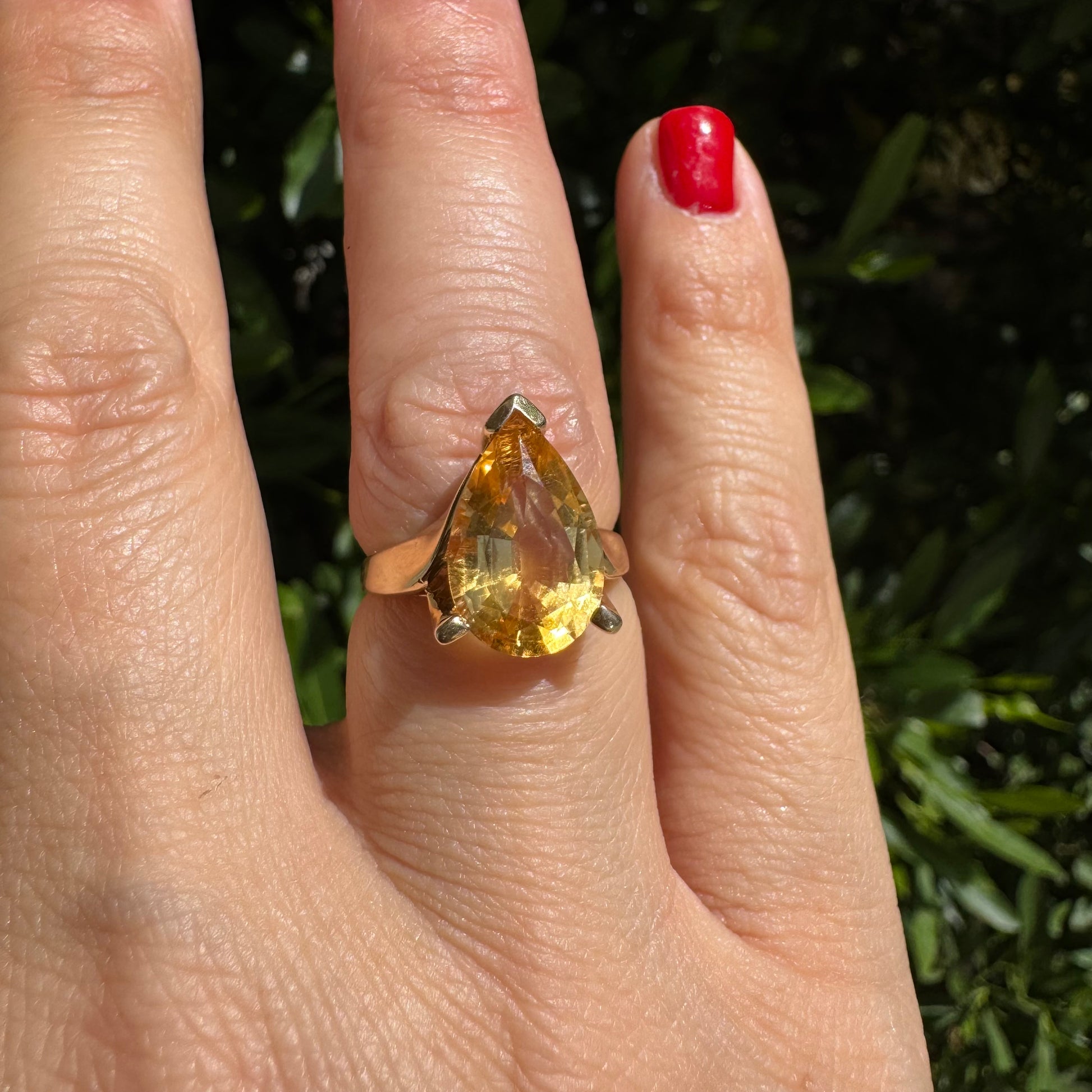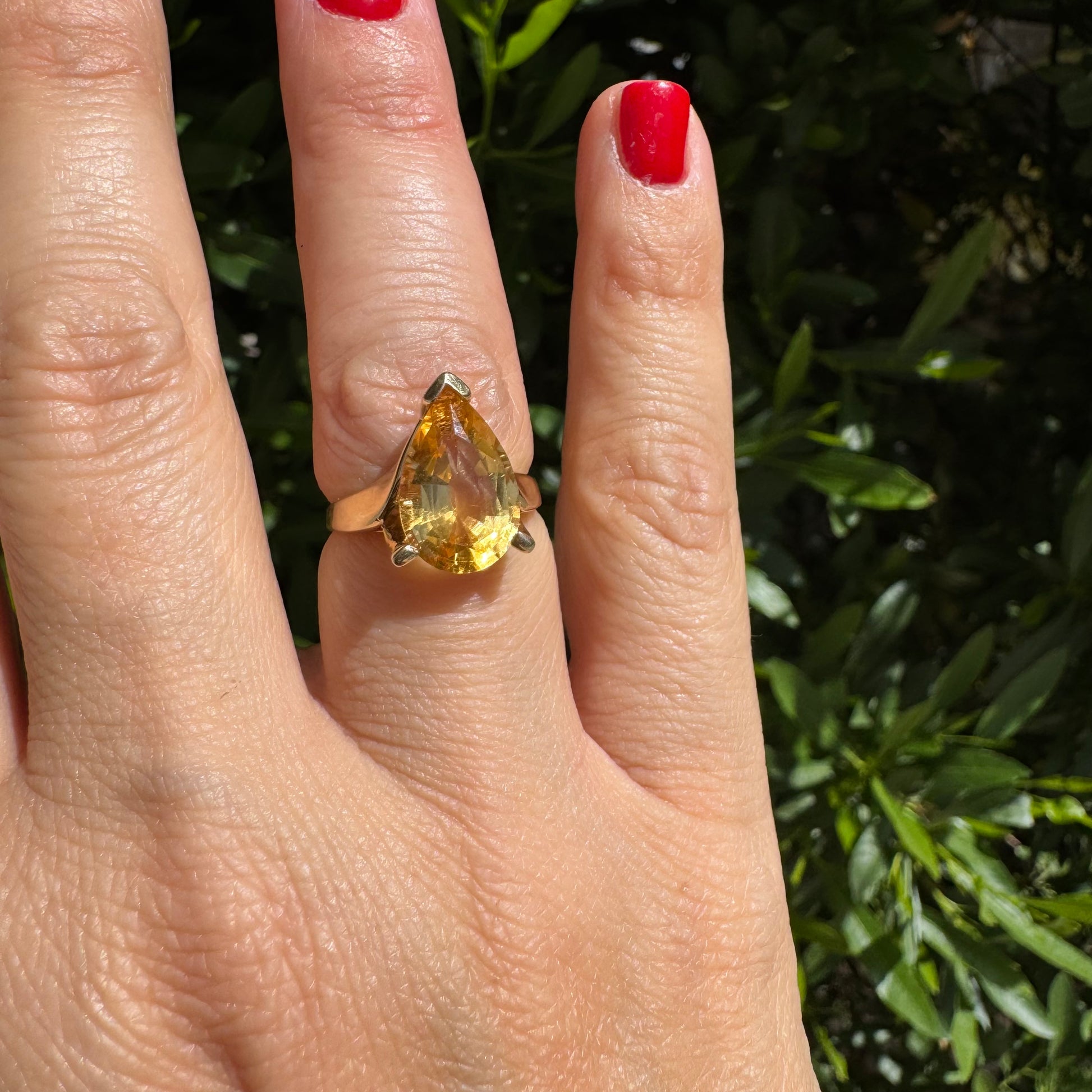 14K gold ring set with a large pear-shaped Citrine