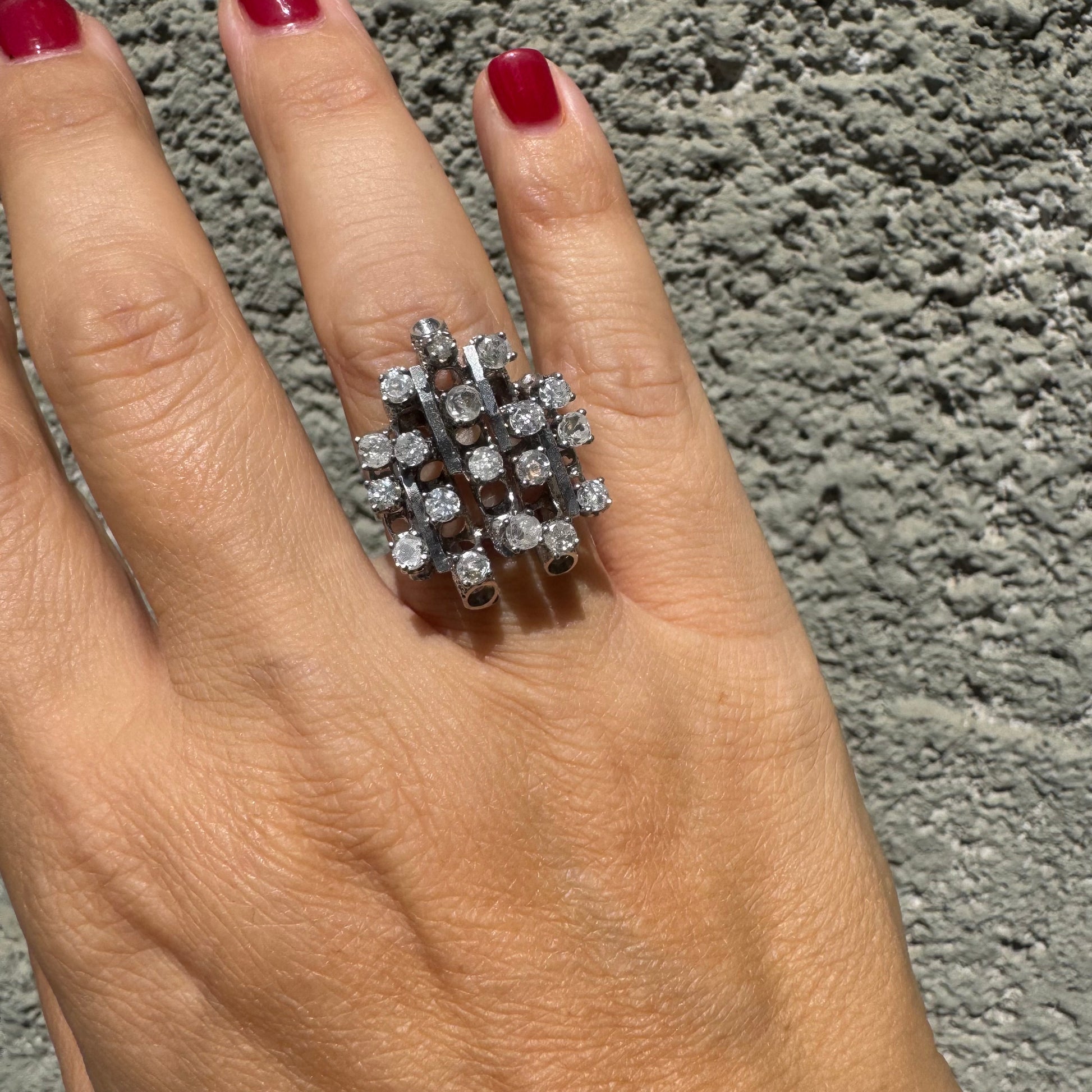 14K white gold ring with a geometric design, set with multiple round Diamonds that create a sparkling, structured look.