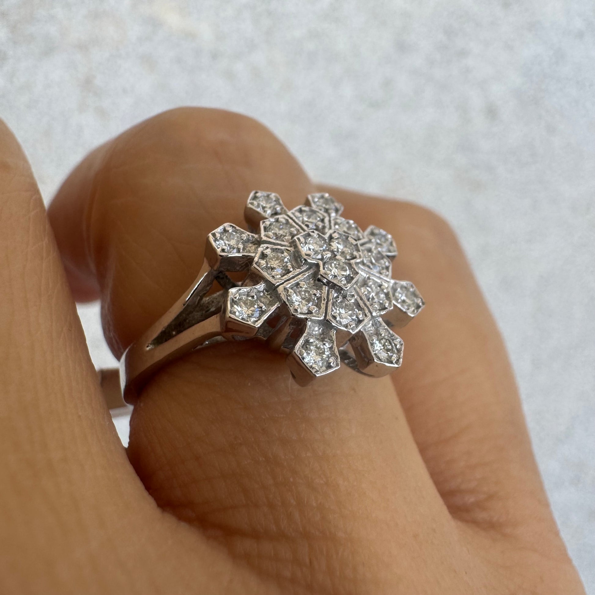 14K white gold ring set with Diamonds in a floral geometric pattern