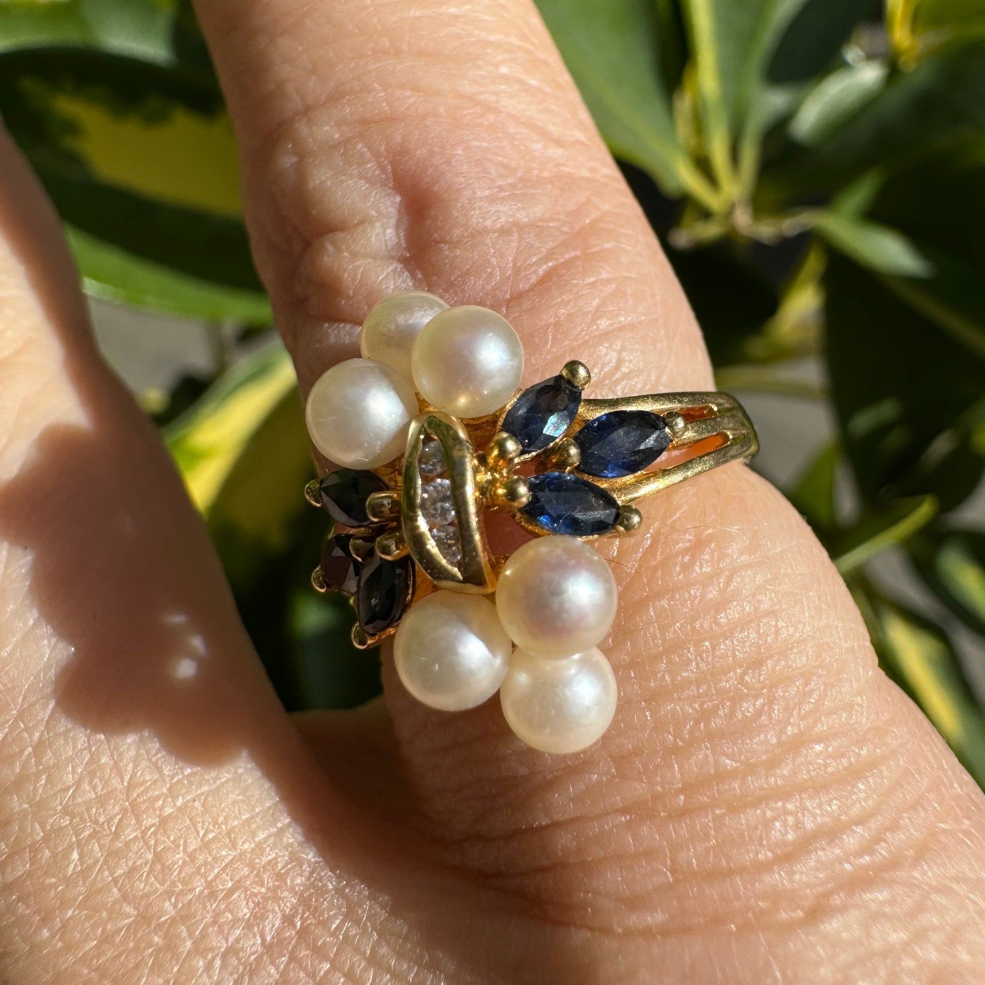 18K gold floral-inspired ring set with Diamonds, Sapphire & Pearls