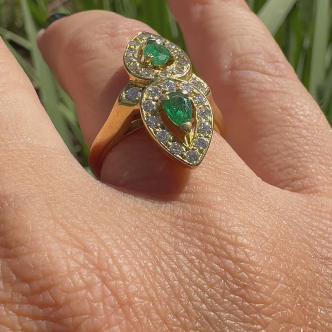 18K yellow gold ring set with two pear-cut Emerald & Diamonds