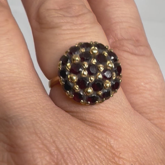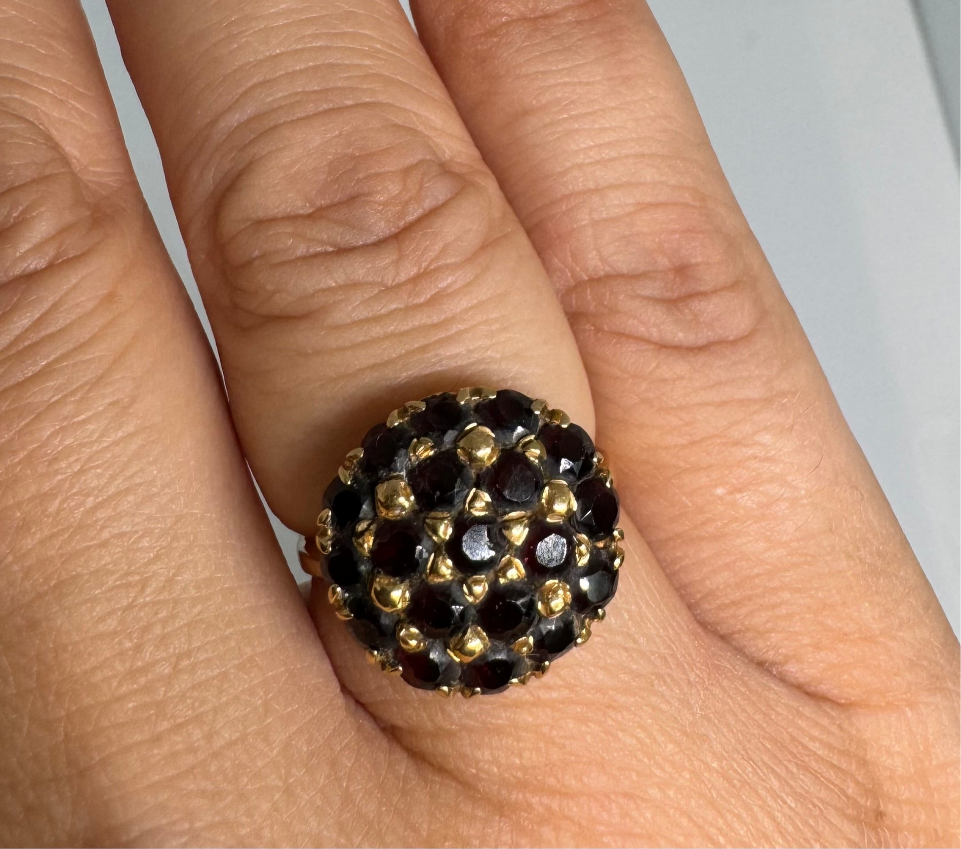 טבעת מעוצבת בעלת מבנה עגול ומחמיא, משובצת אבני גרנט בצבע אדום יין כהה למראה יוקרתי במיוחד