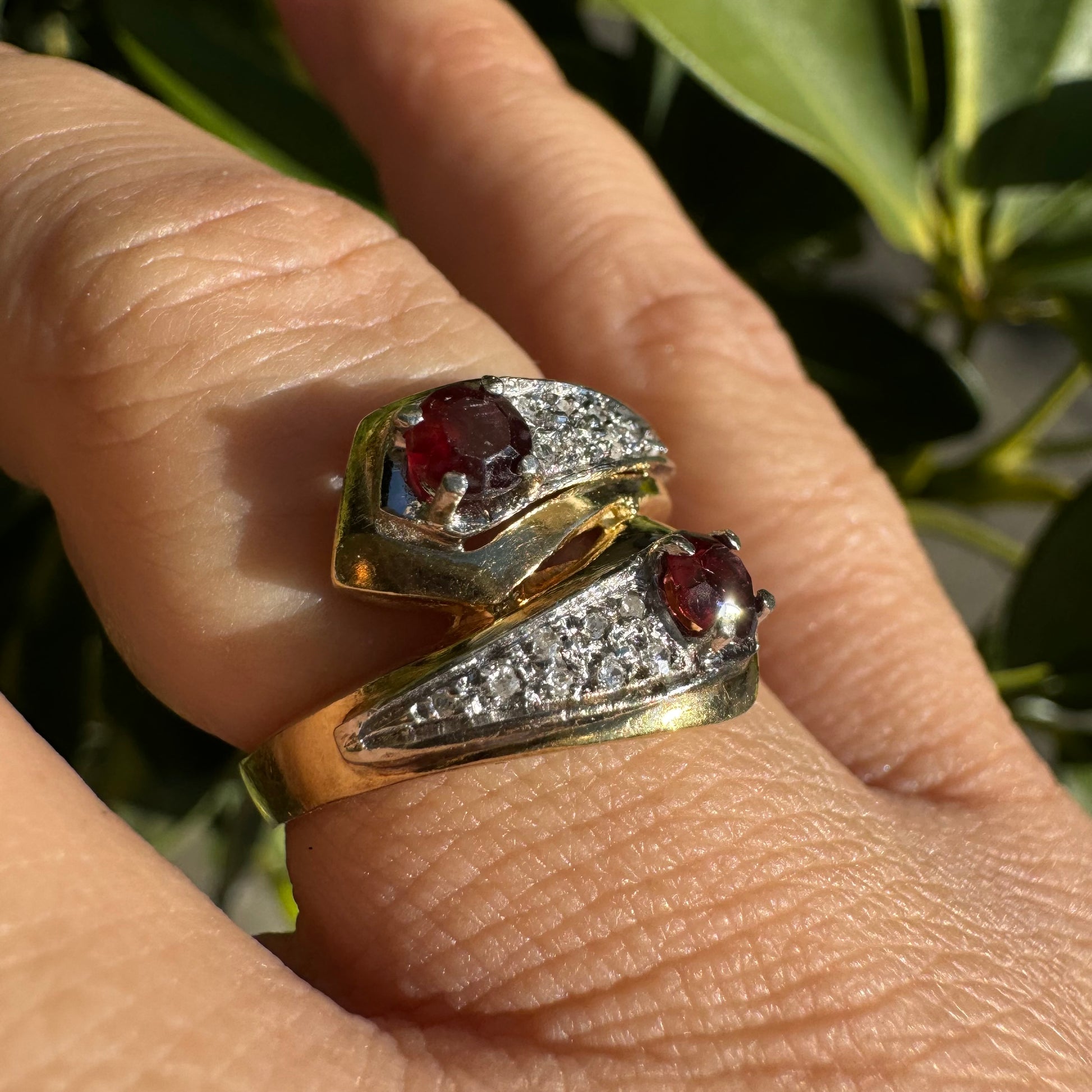 טבעת זהב צהוב 18 קראט משובצת יהלומים ואבני גרנט