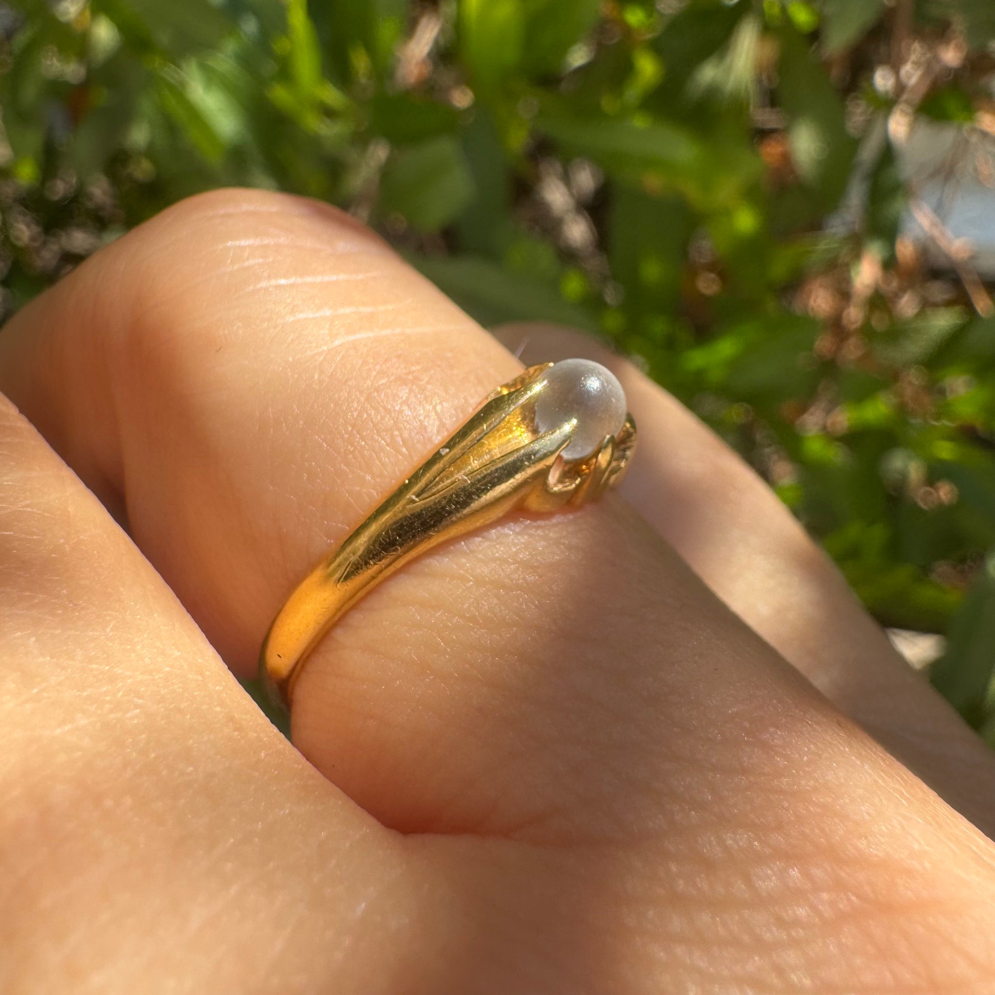 18K yellow gold ring featuring a smooth round Moonstone set in a delicate floral-inspired design.