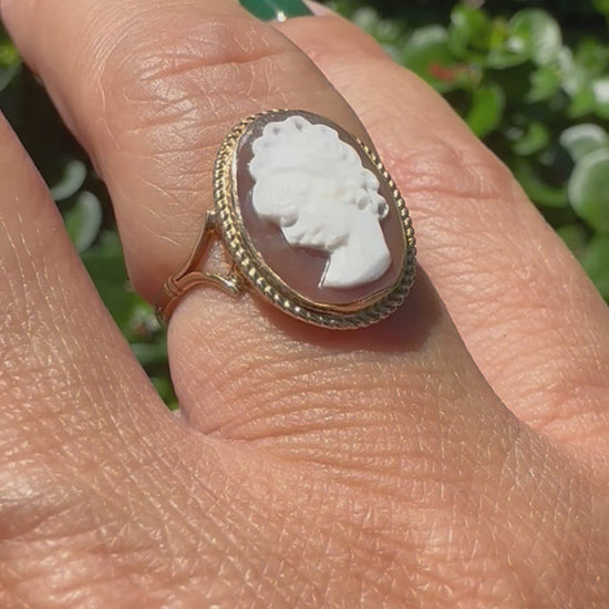 טבעת זהב צהוב 9 קראט משובצת גילוף על צדף דמות נשית
