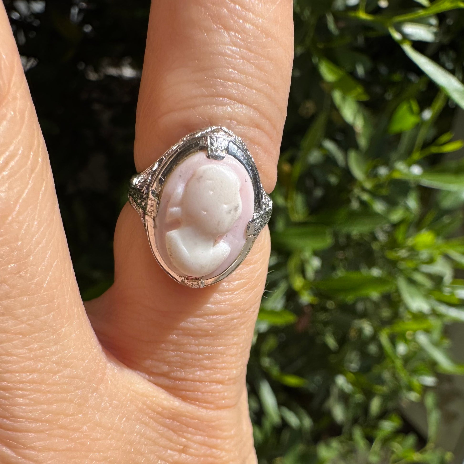 טבעת פלטינה משובצת בדמות פרופיל עדינה על רקע ורדרד-לבן, במסגרת מעוטרת בסגנון קלאסי.