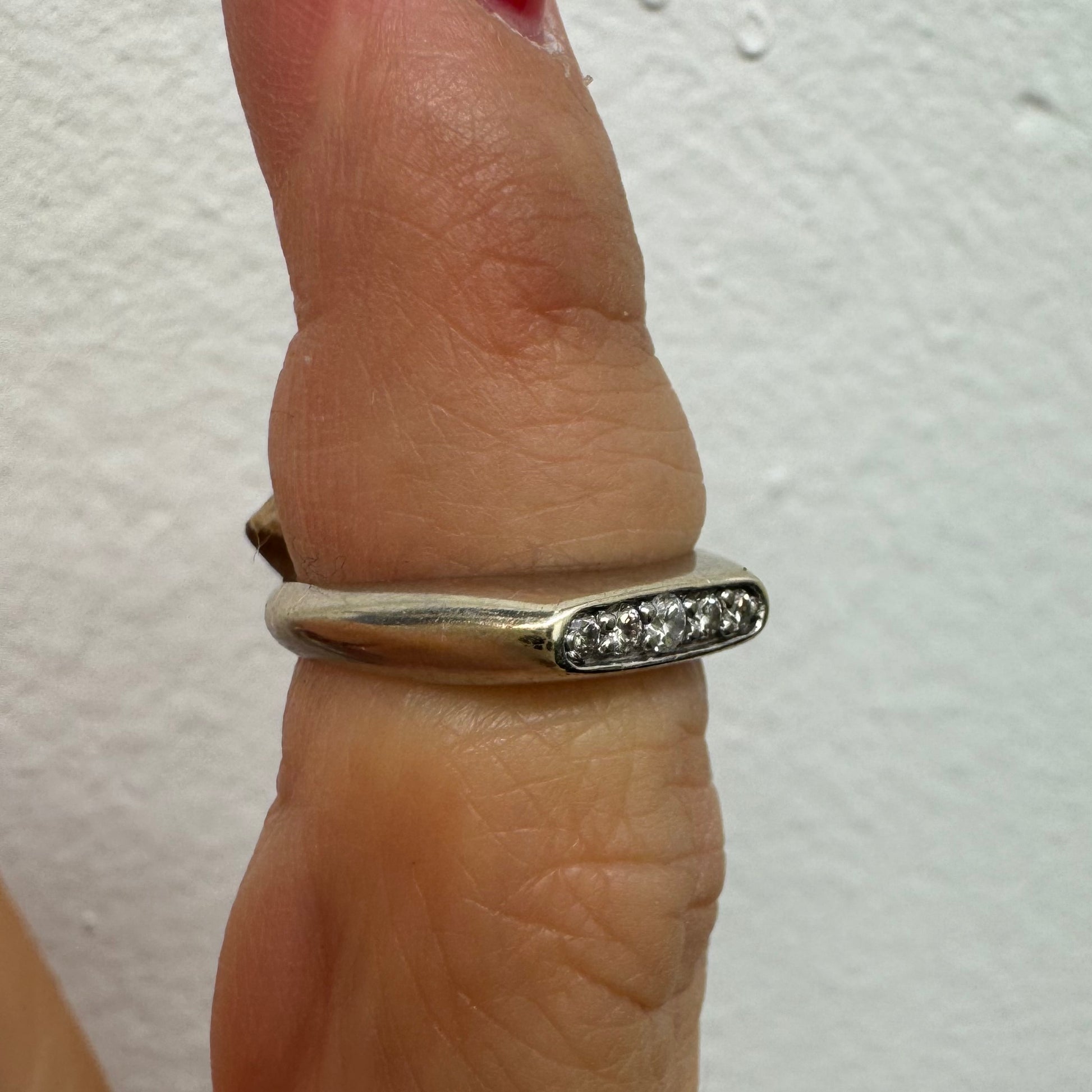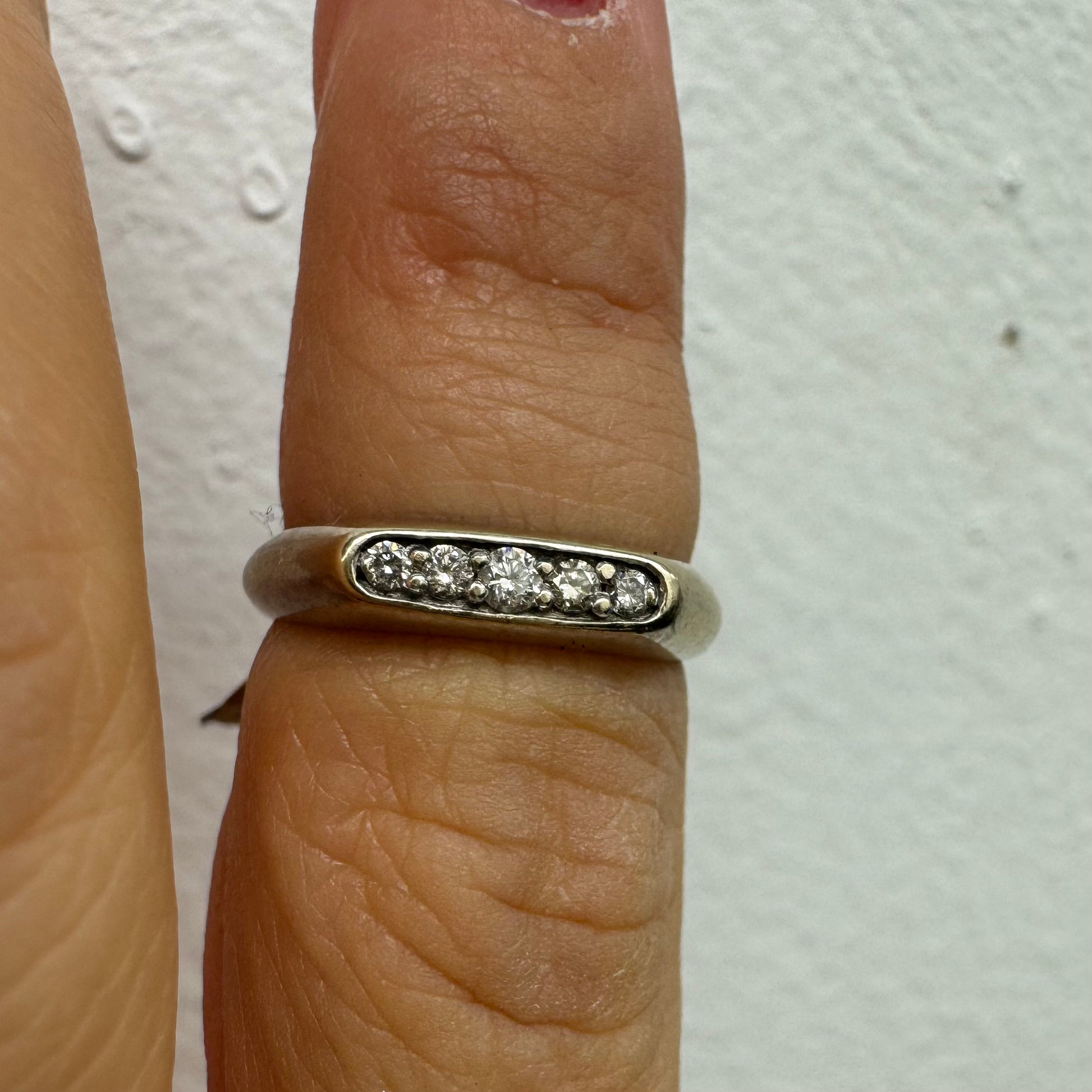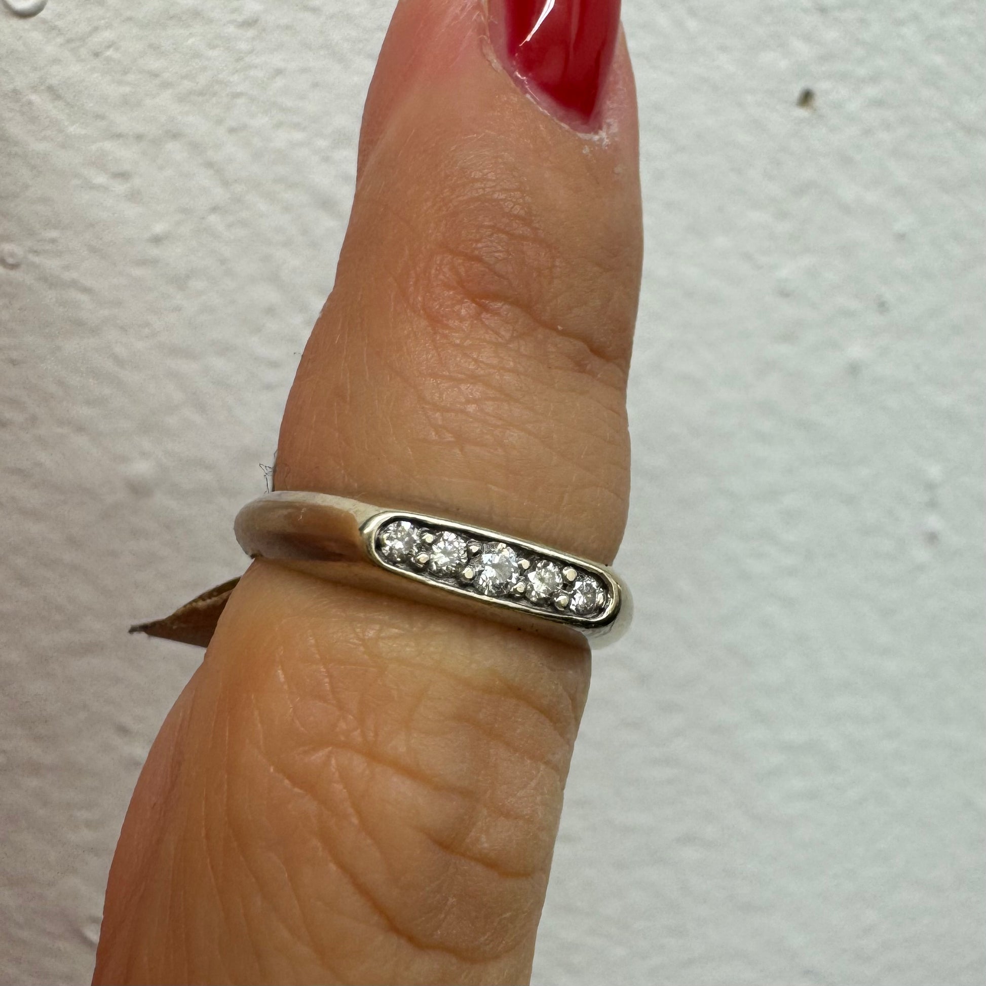 טבעת זהב לבן 14 קראט, בעיצוב עדין וקלאסי, משובצת שורת יהלומים קטנים במסגרת חלקה ונוחה לענידה יומיומית.