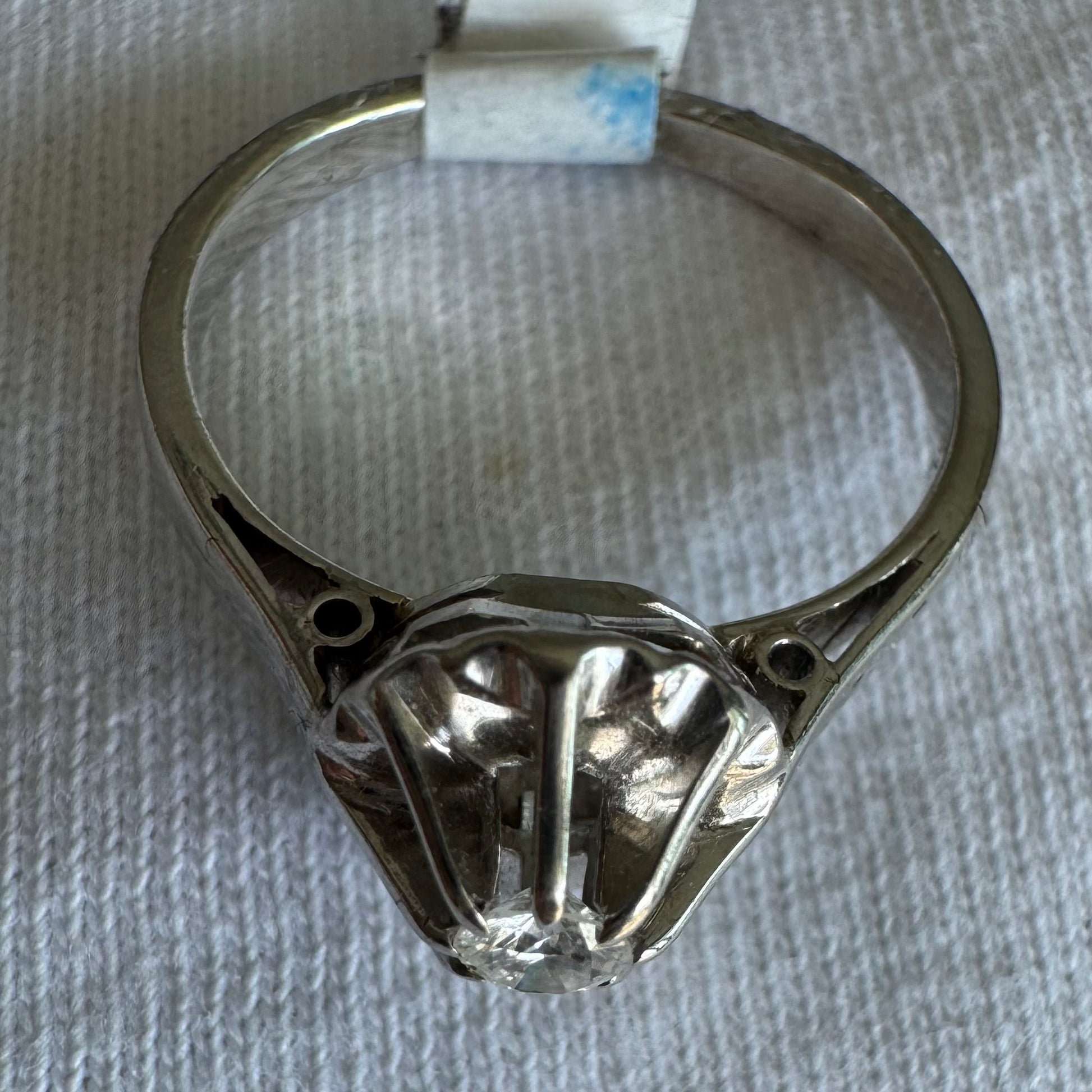 טבעת זהב לבן 18 קראט בעיצוב פיסולי עם יהלום מרכזי בחיתוך מבריק, משובץ במסגרת מחורצת שמשקפת את האור בעוצמה. פריט וינטג’ ייחודי ובעל נוכחות זוהרת.