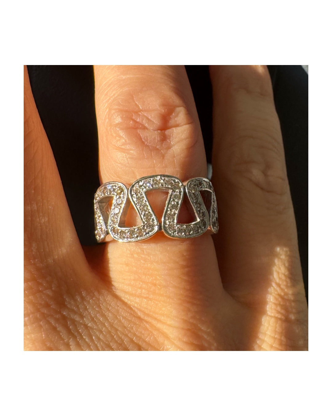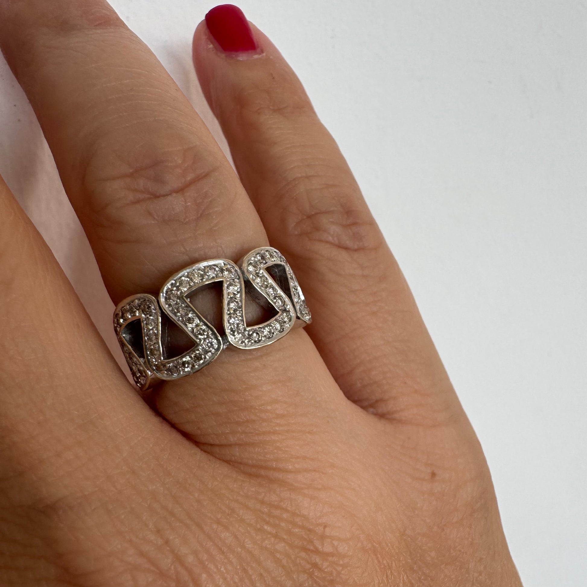 טבעת זהב לבן 18 קראט מעוצבת בחוליות גאומטריות פתוחות, משובצות יהלומים קטנים ומבריקים