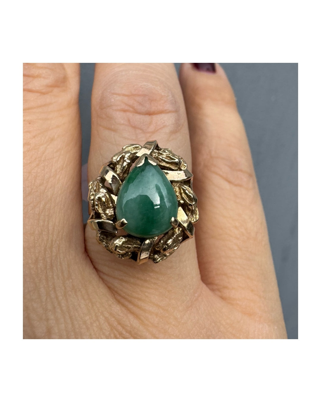 טבעת זהב צהוב 14 קראט משובצת אבן ג׳ייד (ירקן) ירוקה בליטוש קבושון בצורת טיפה (tear drop/pear shape), משובצת בתוך מסגרת זהב עשירה בעיצוב טקסטורות ועלים.