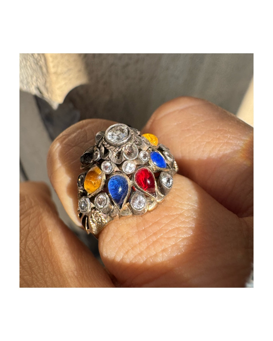 טבעת זהב צהוב 14 קראט משובצת אבן מרכזית שקופה וסביבה פסיפס צבעוני של אבני חן צבעוניות: גרנט, עין הנמר, ואבני חן נוספות, בשיבוץ ידני בסגנון עתיק