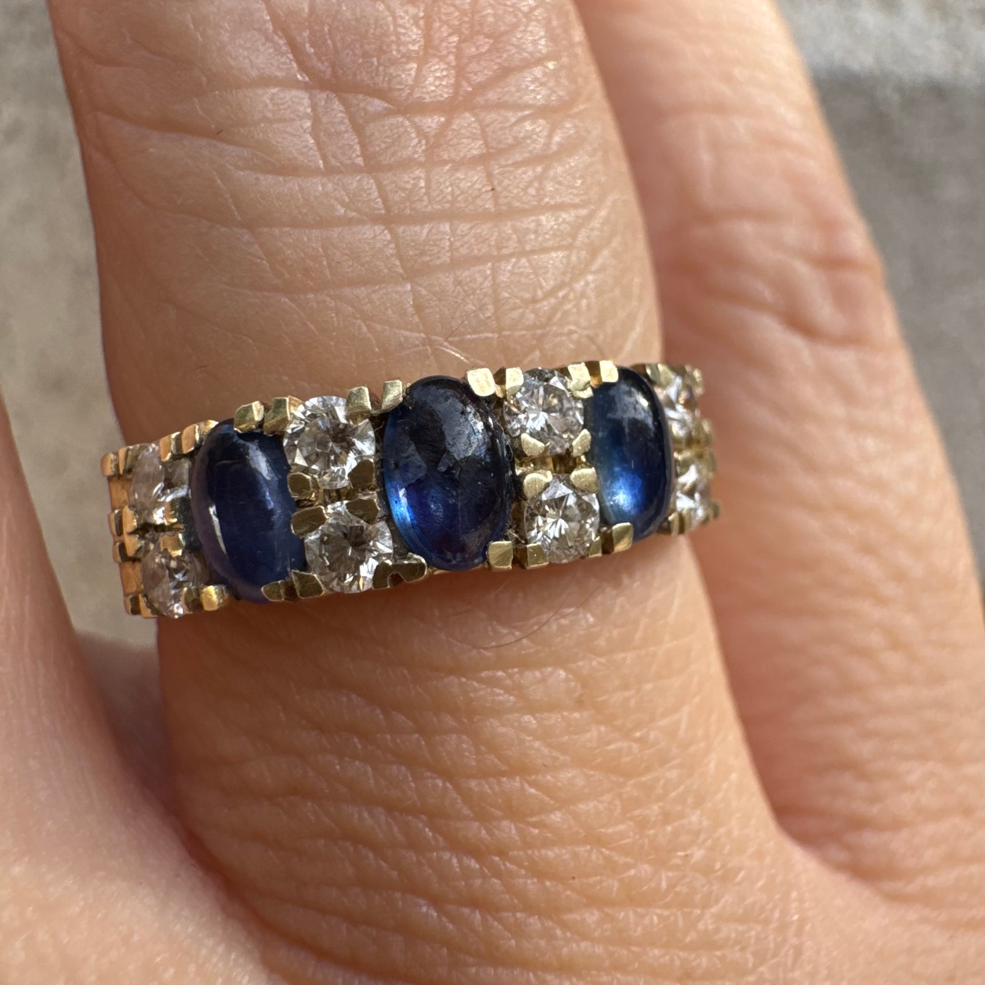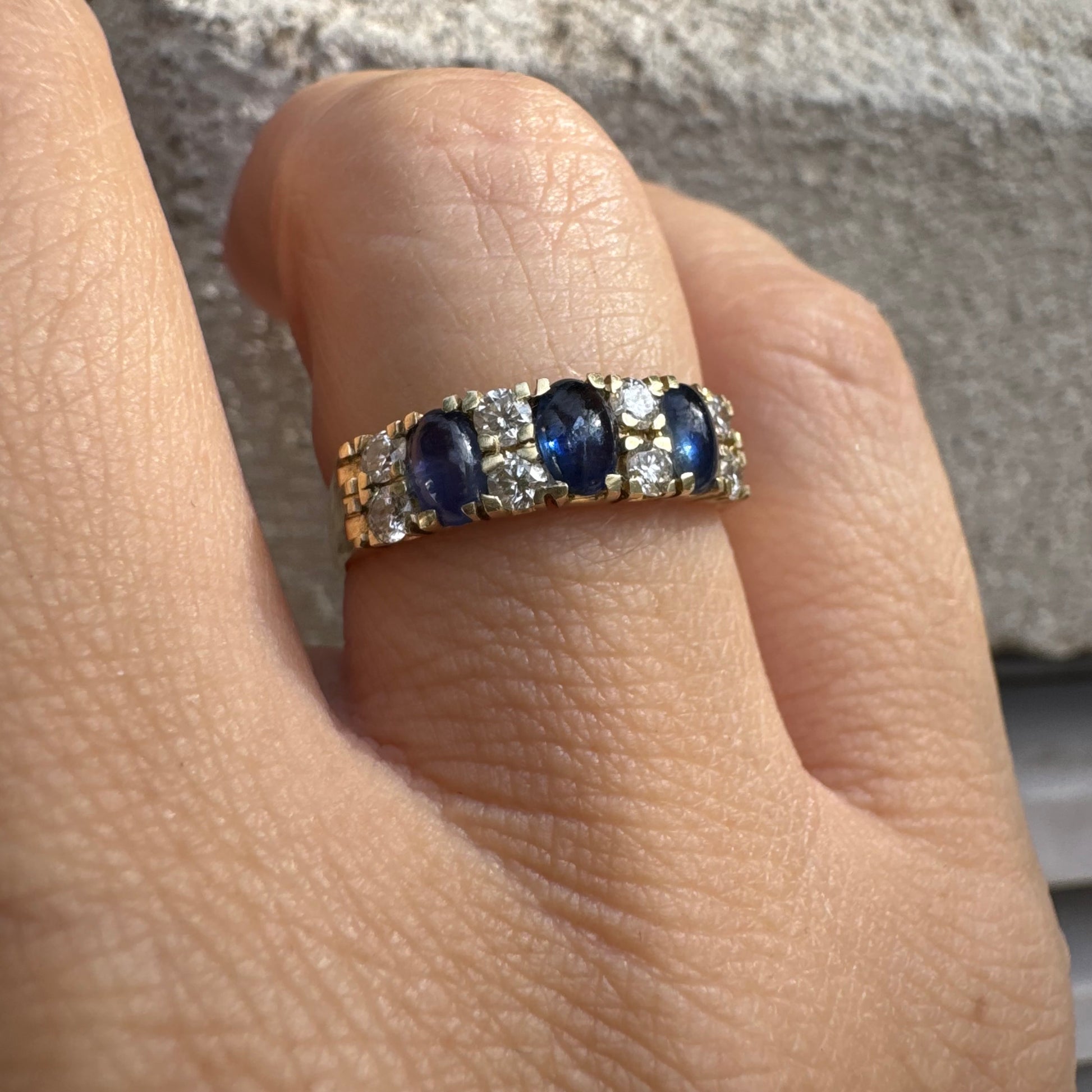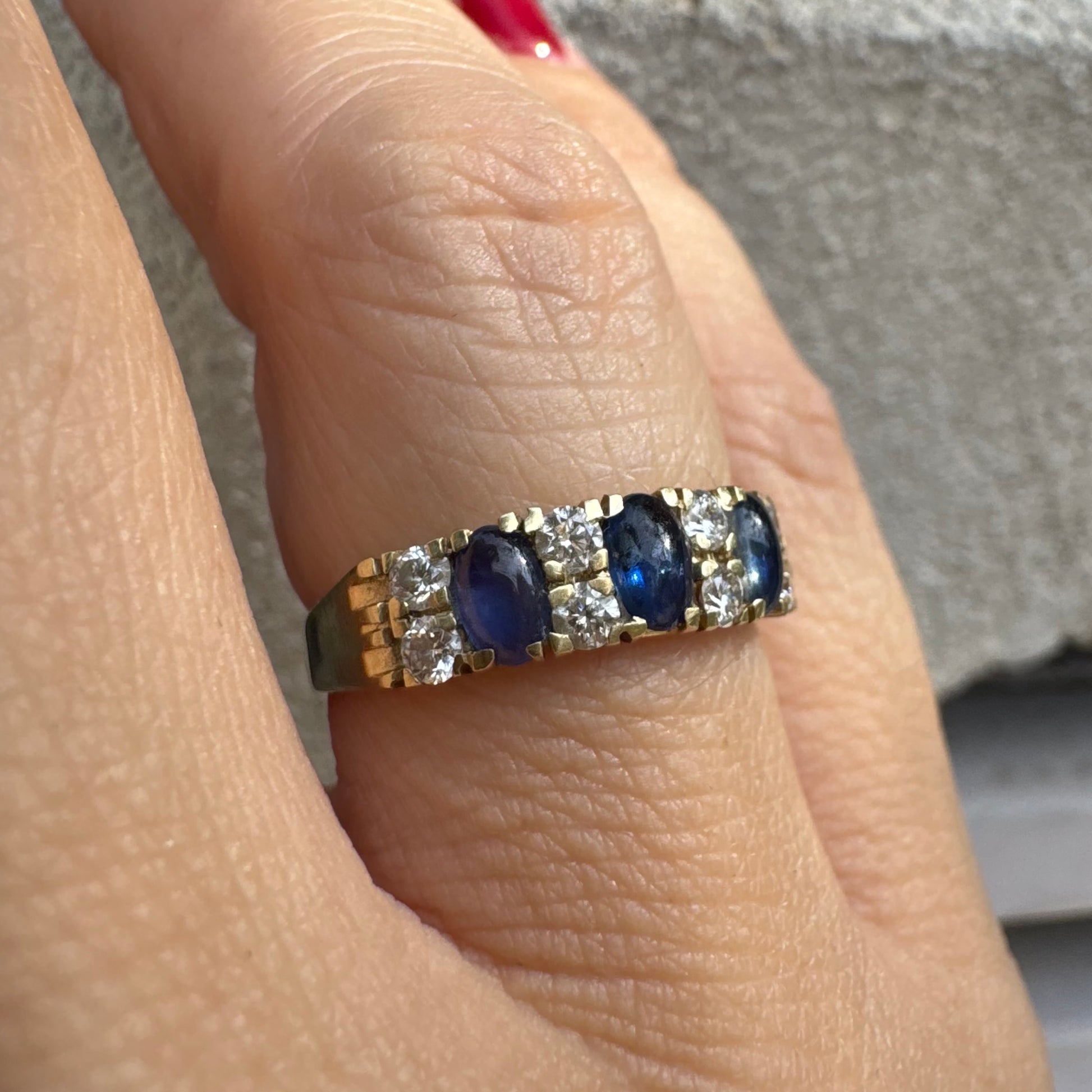 טבעת זהב צהוב 14 קראט משובצת אבני ספיר ויהלומים בשורה אחת