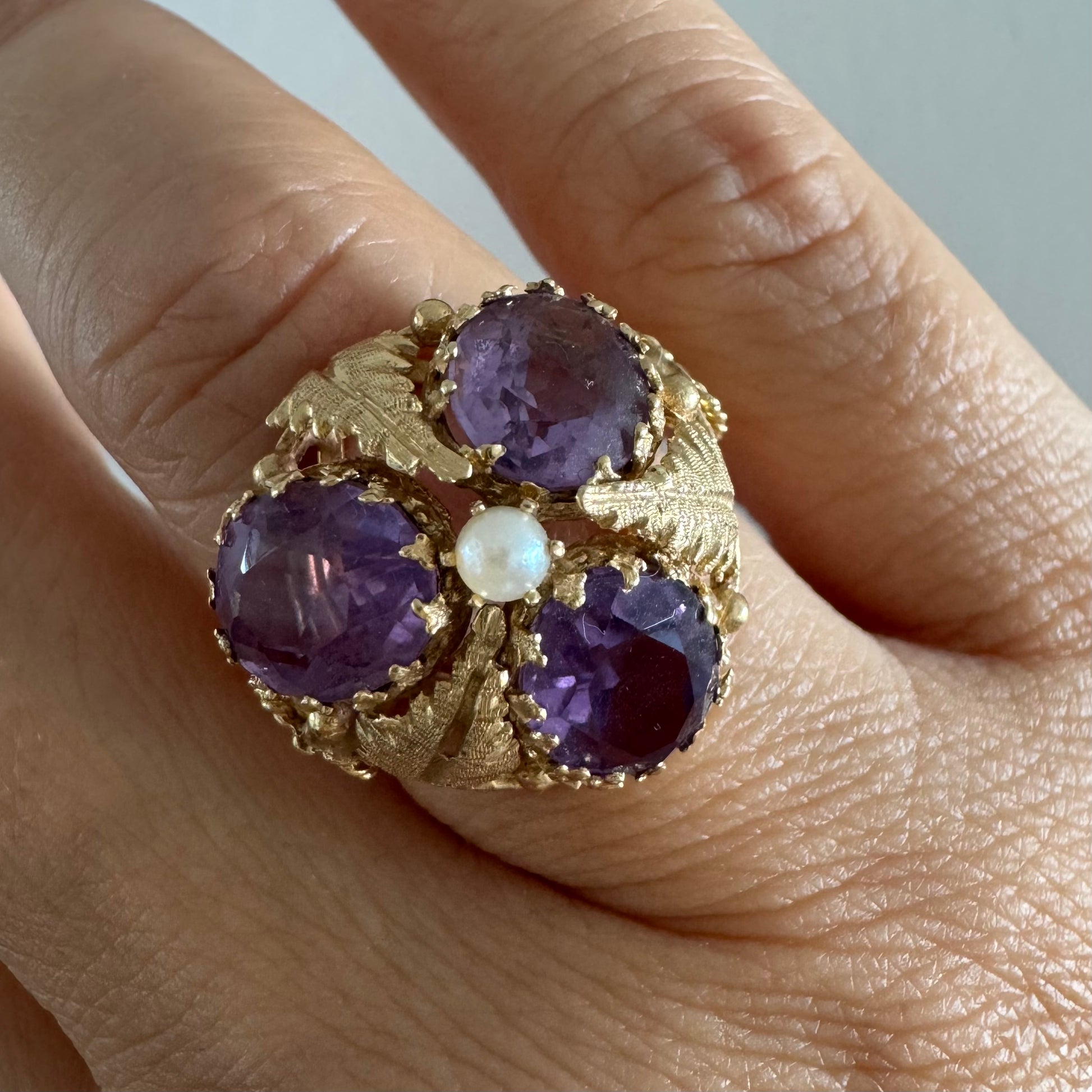 טבעת זהב צהוב 14 קראט משובצת ארבע אבני אמטיסט סגולות בוהקות ופנינה עדינה במרכזה.