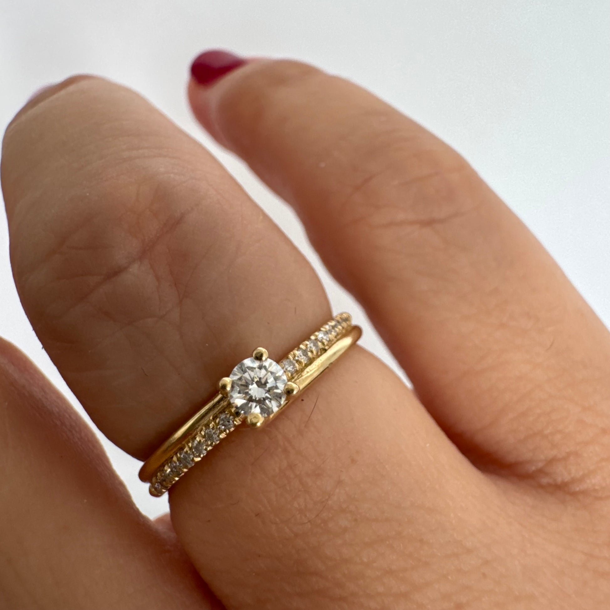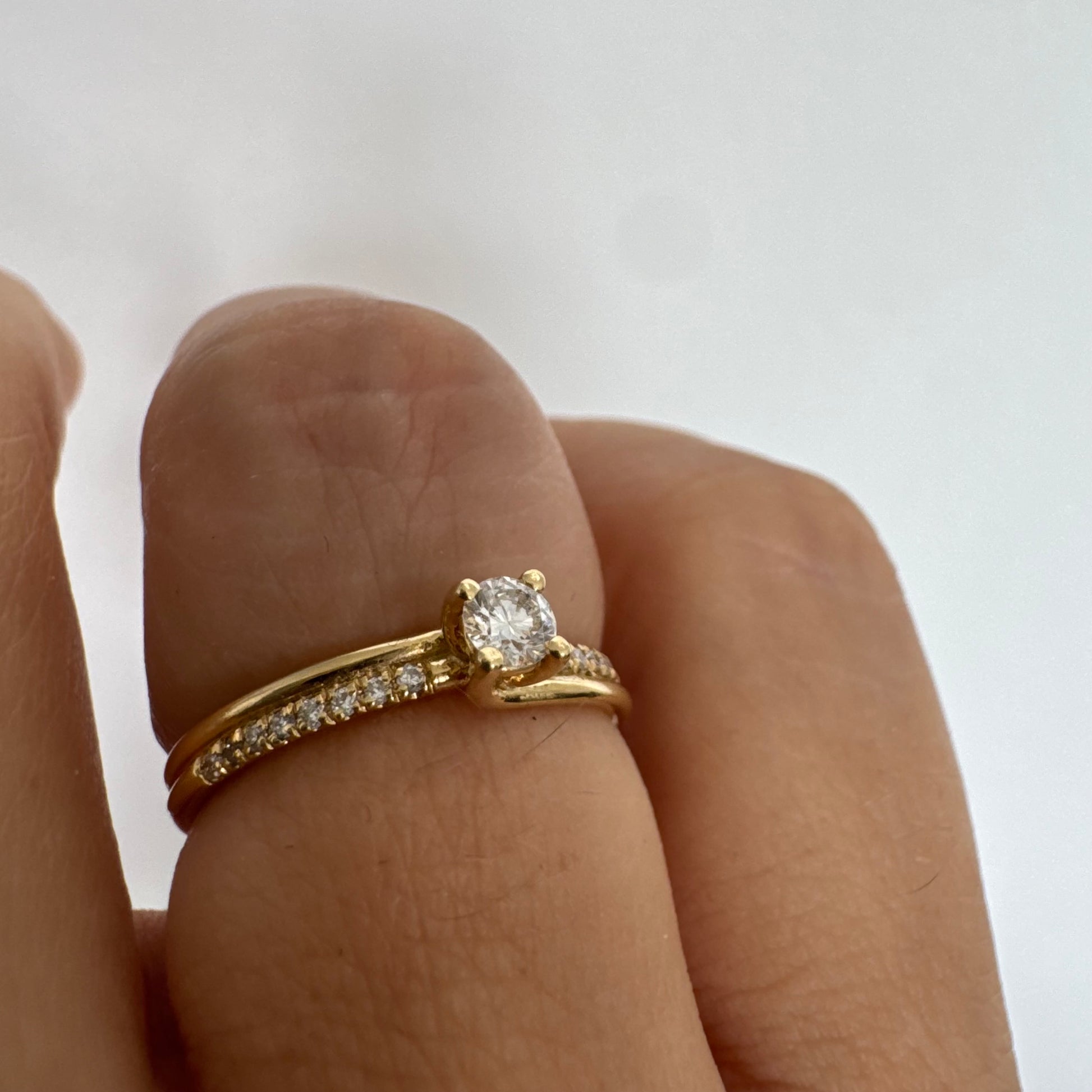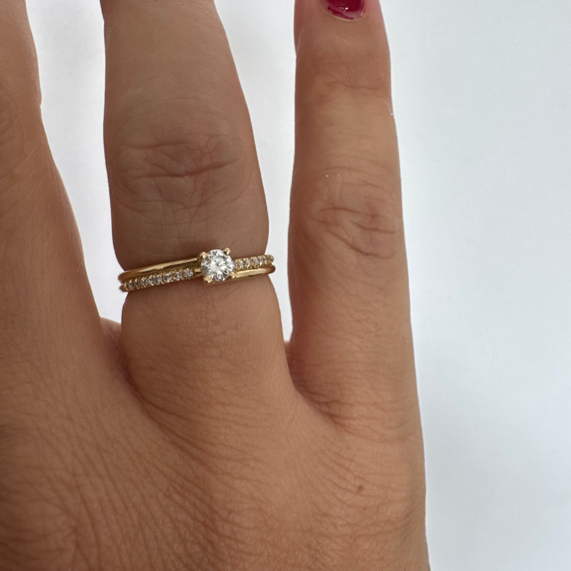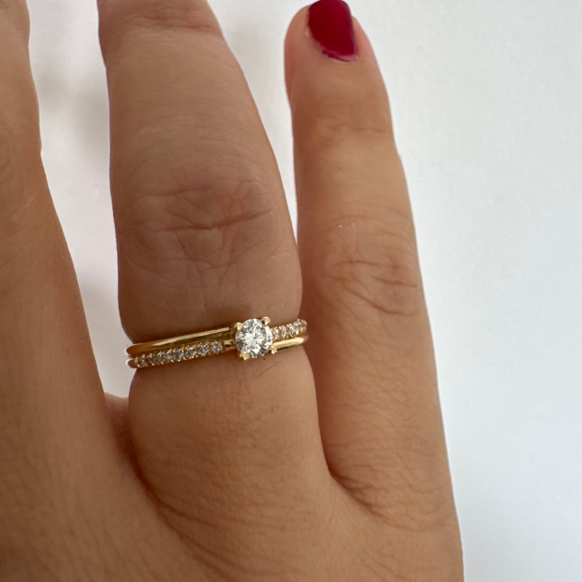 טבעת זהב צהוב 14 קראט משובצת יהלום מרכזי בחיתוך עגול ופס יהלומים עדין.
