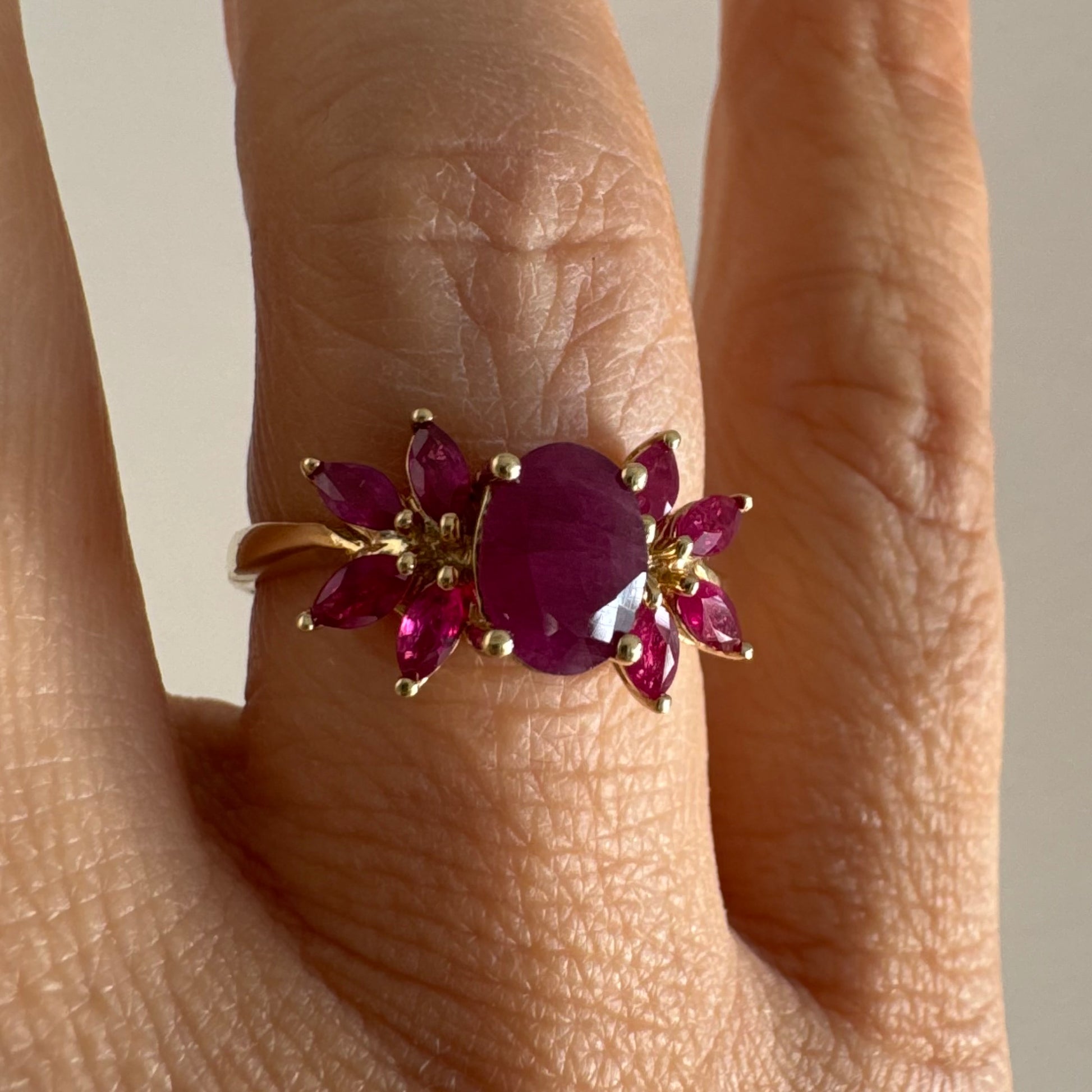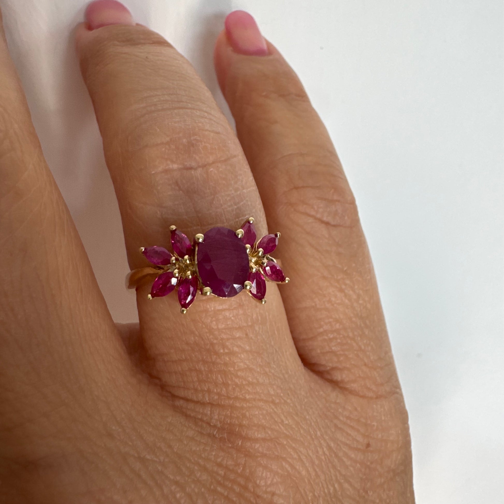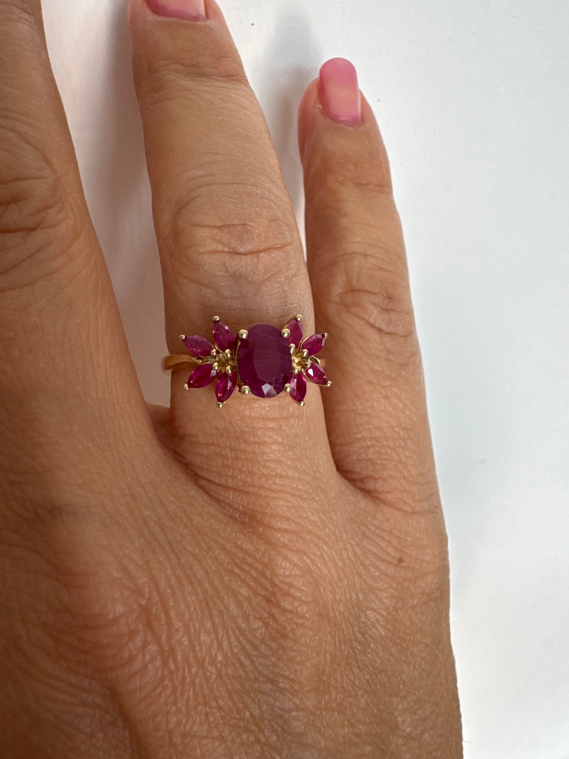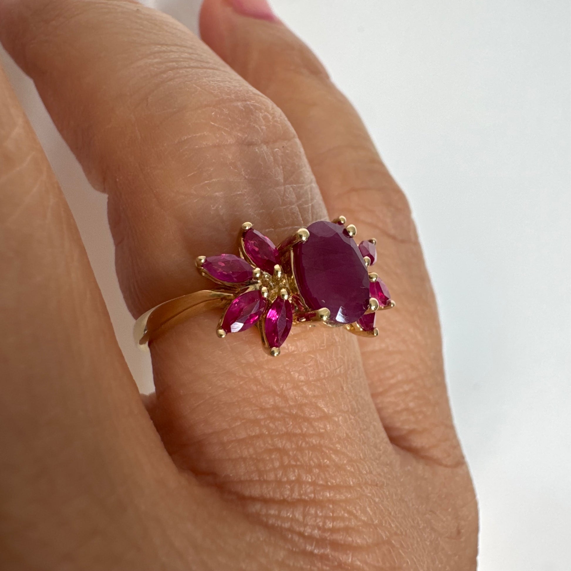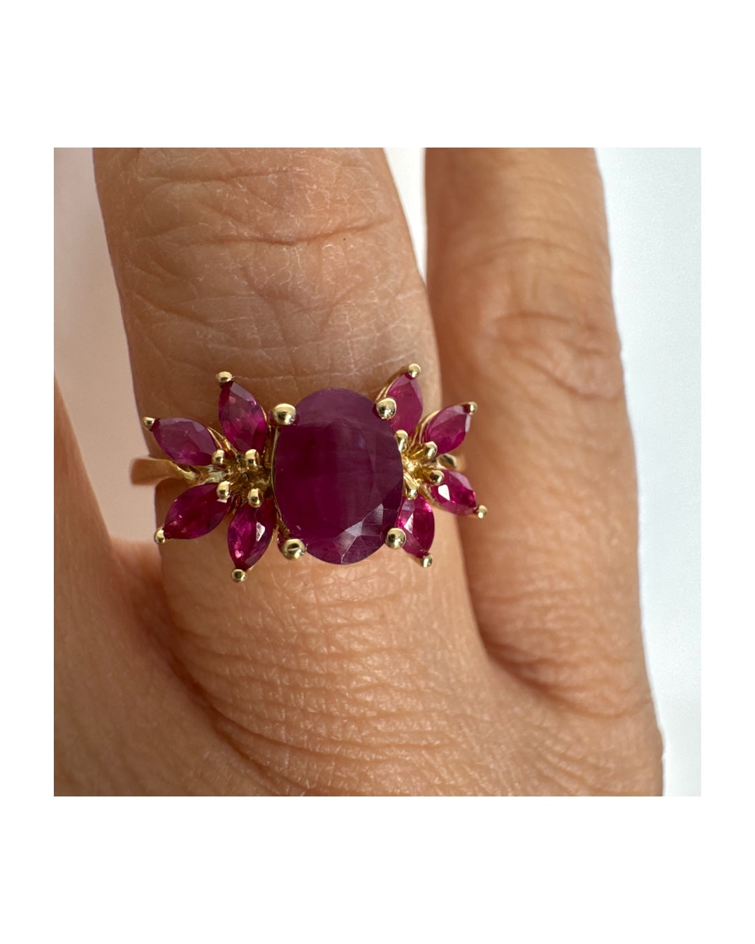 טבעת זהב צהוב 14 קראט משובצת רובי מרכזי גדול ולצידו רובי בחיתוך מרקיזה בעיצוב פרחוני עשיר.