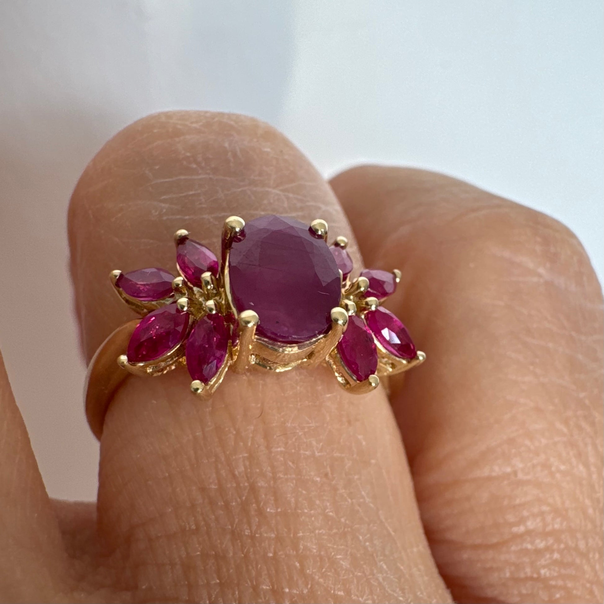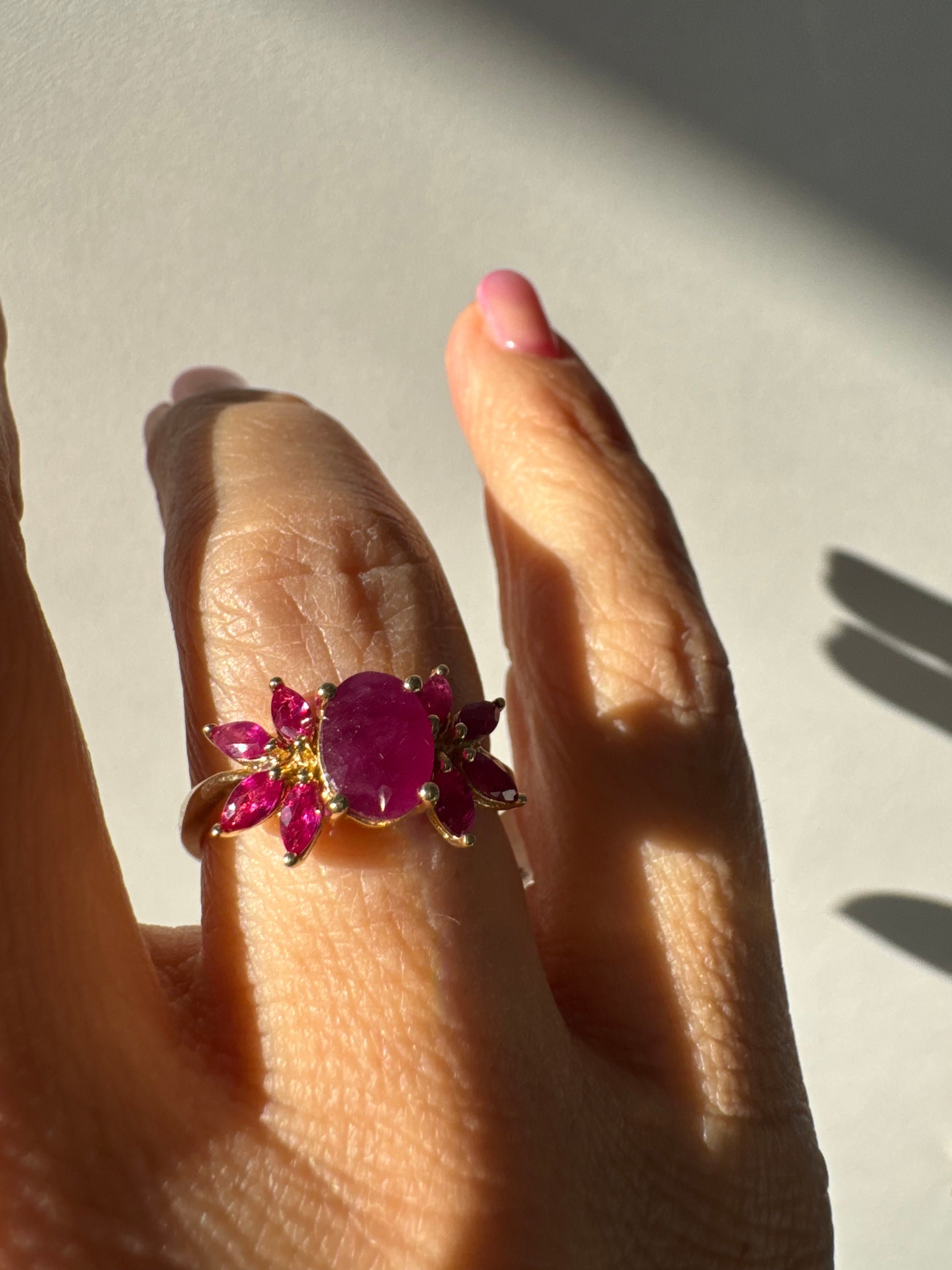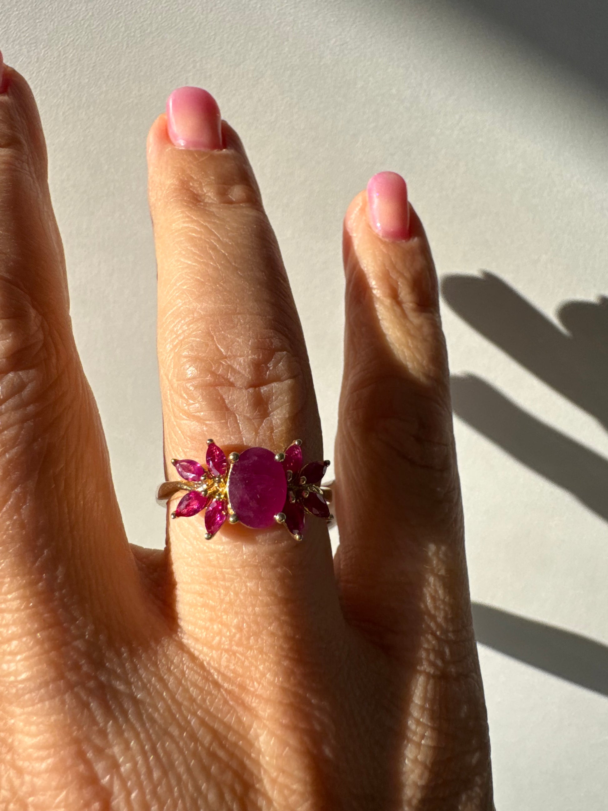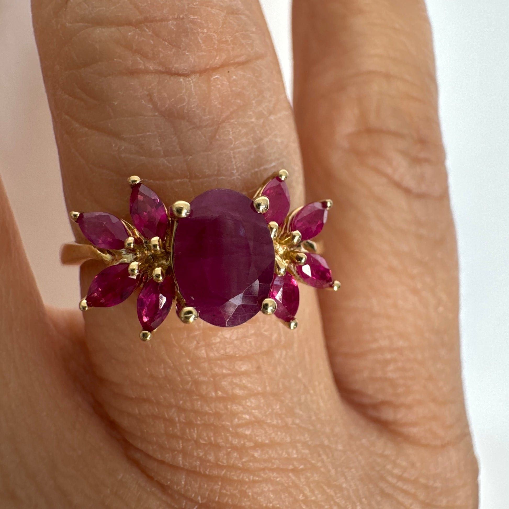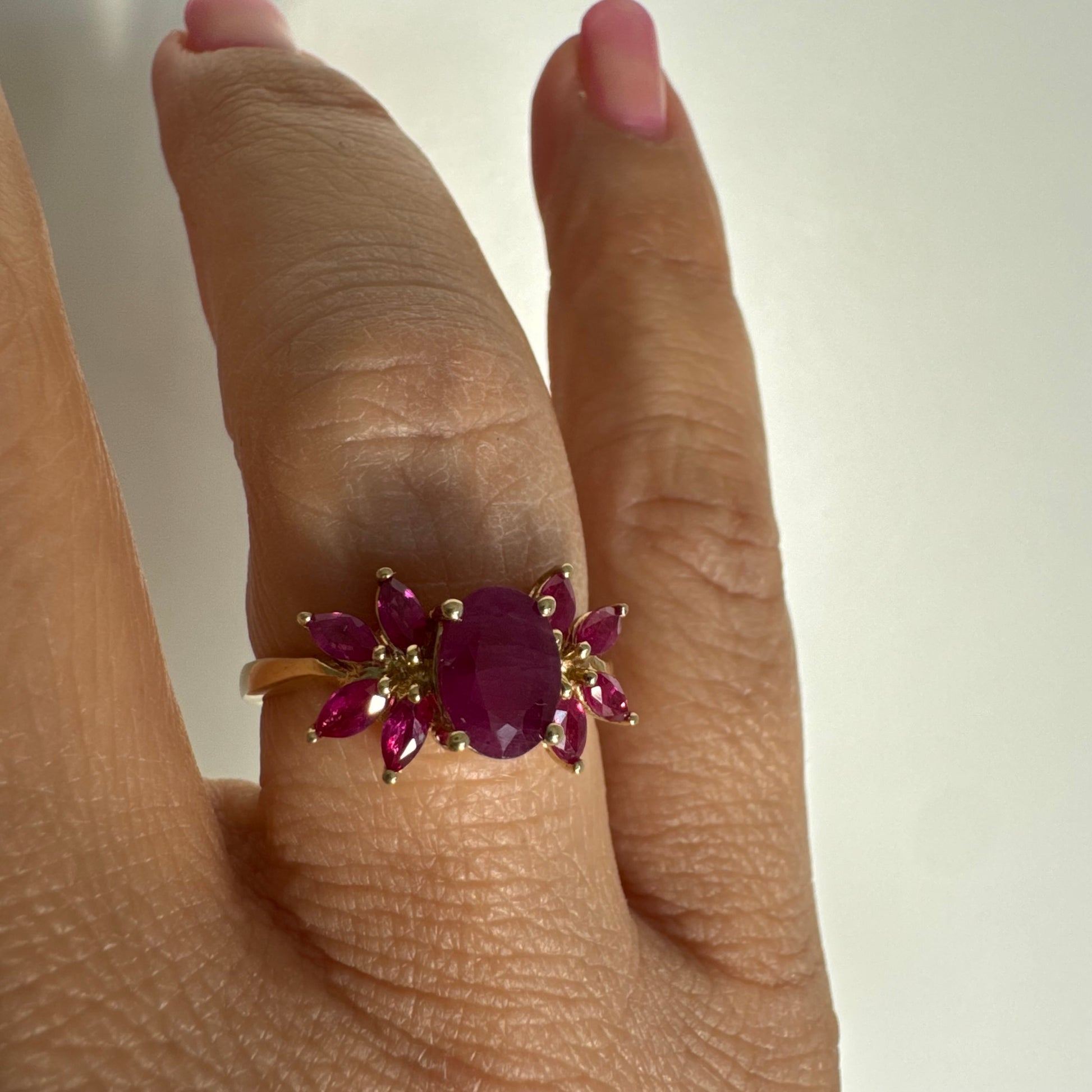 טבעת זהב צהוב 14 קראט משובצת רובי מרכזי גדול ולצידו רובי בחיתוך מרקיזה בעיצוב פרחוני עשיר.