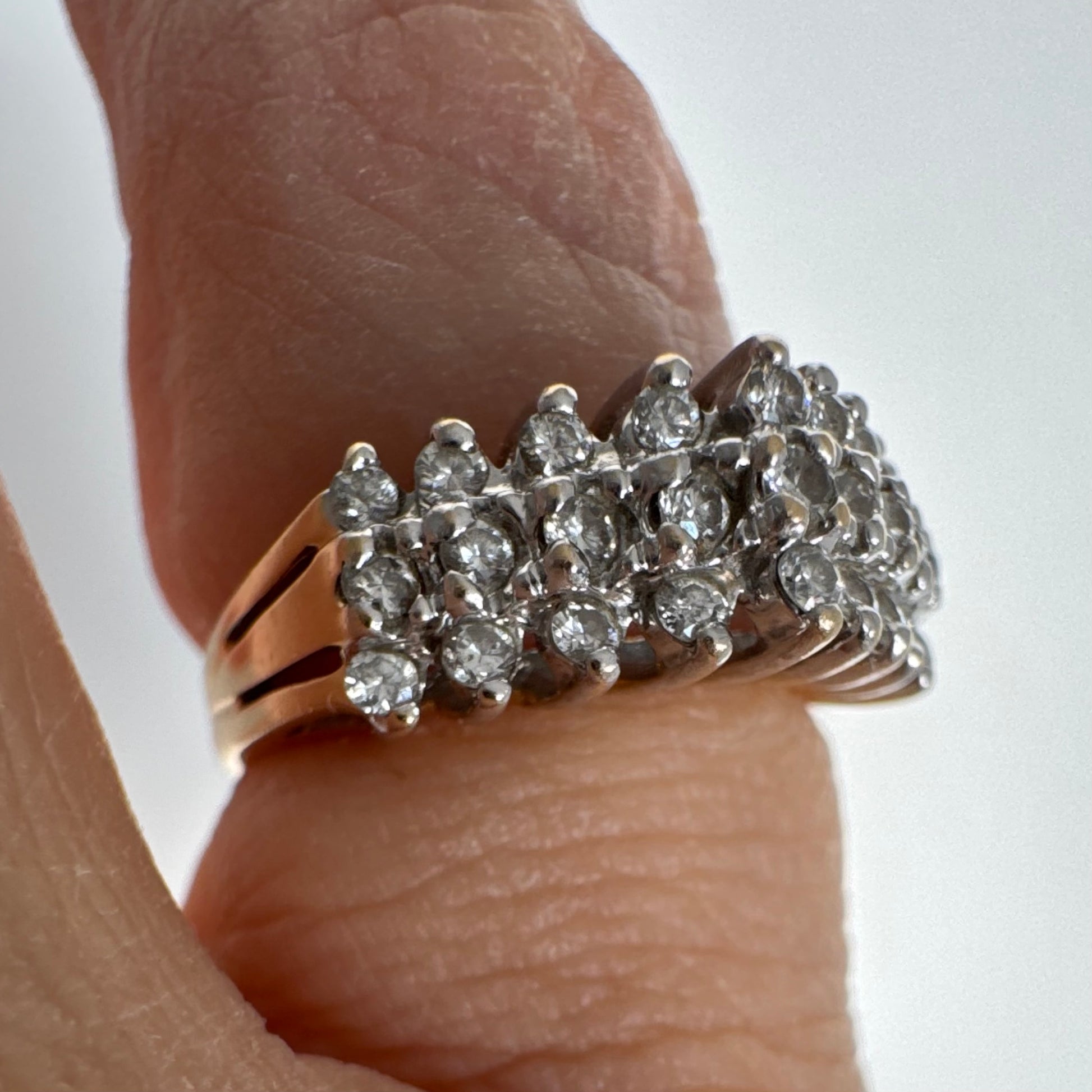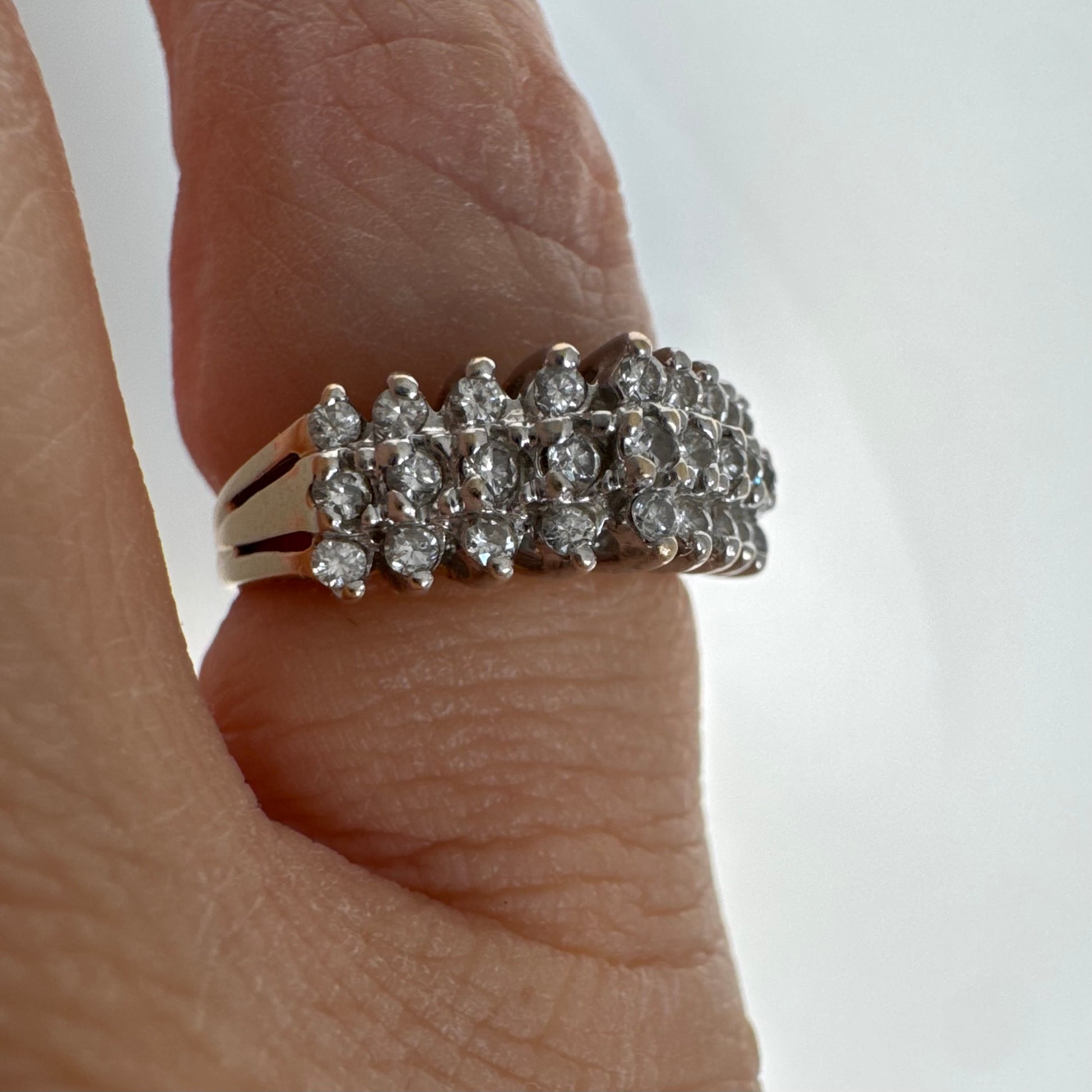 טבעת זהב צהוב 14 קראט משובצת שורות של יהלומים עגולים.