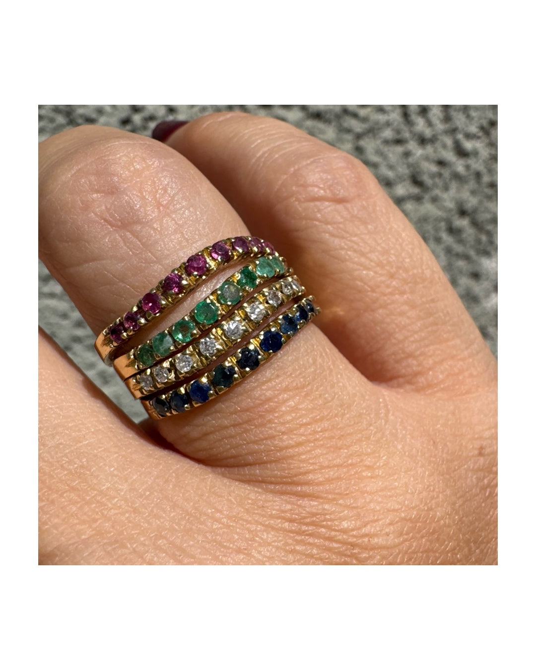 טבעת זהב צהוב 18 קראט, משובצת בשורות צבעוניות של ספירים, אמרלדים, רובינים ויהלומים – פריט אלגנטי מלא חיים וזוהר.